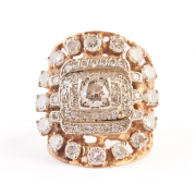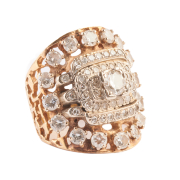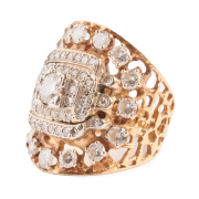 Centering one transitional round-cut diamond weighing approximately 0.45 ct., accented by forty-two single-cut diamonds weighing a total of approximately 0.65 cttw., further enhanced by sixteen full-cut diamonds weighing a total of approximately 1.75 cttw., set in a 14k yellow gold mounting measuring approximately 25 mm in width. Total diamond weight for the ring is approximately 2.85 cttw.
