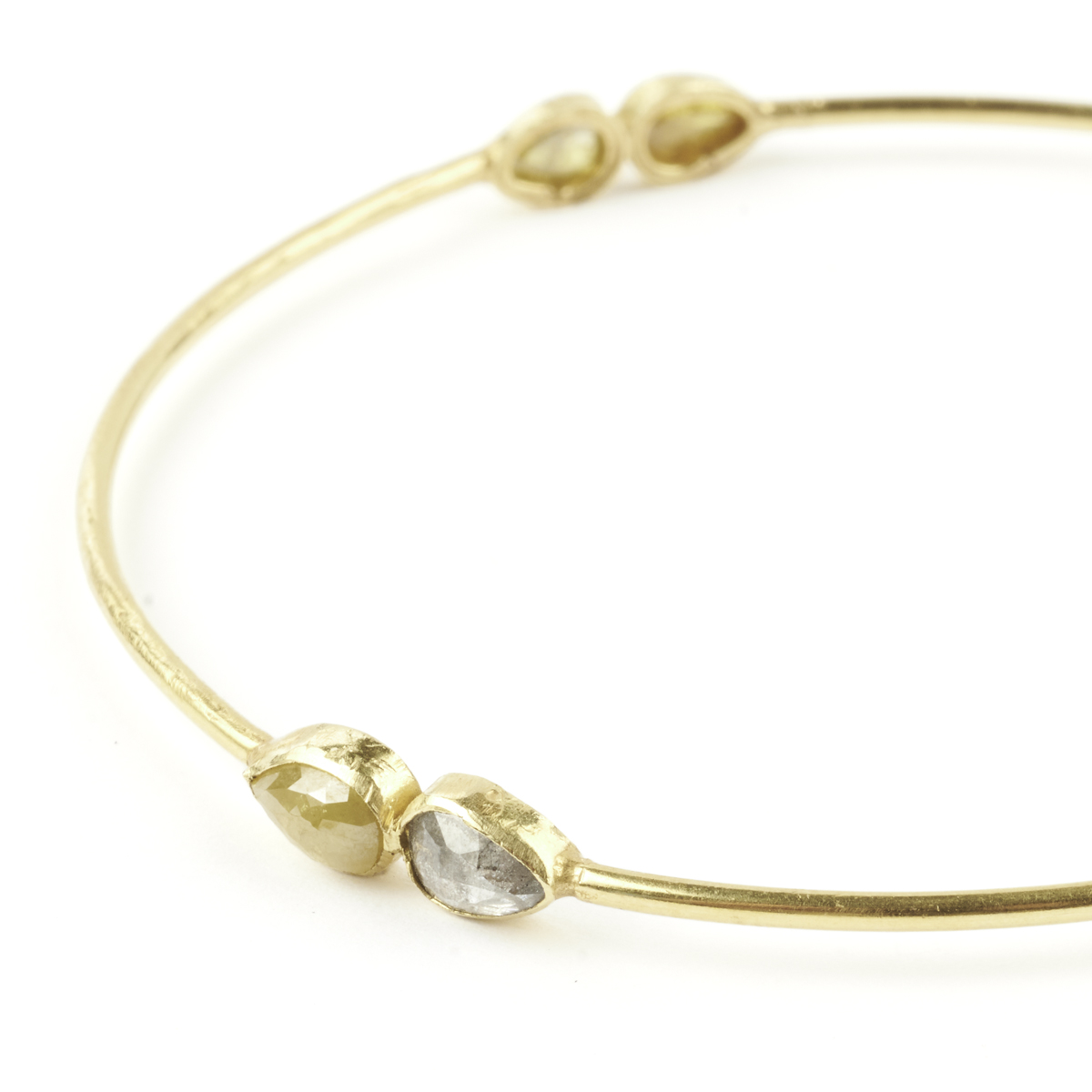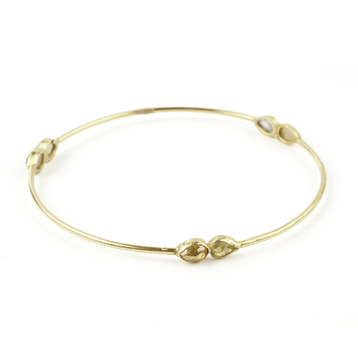 Featuring six pear shaped rose-cut diamonds measuring approximately 6.4 x 5.1 mm, bezel set in an 18k yellow gold textured bangle mounting with an internal diameter of approximately 65 mm.