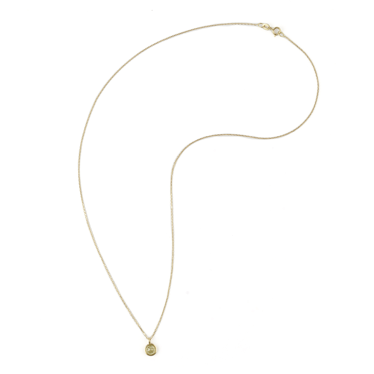 Featuring one rose-cut diamond measuring approximately 5.2 mm, bezel set in an 18k yellow gold mounting, suspended from an 18k yellow gold chain, forming a 17 inch necklace.