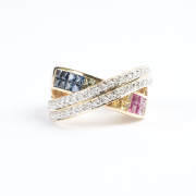 Featuring twenty-six square-cut multicolored sapphires weighing a total of approximately 1.00 cttw., accented by forty-two full-cut diamonds weighing a total of approximately 0.20 cttw., set in a 14k yellow gold mounting.