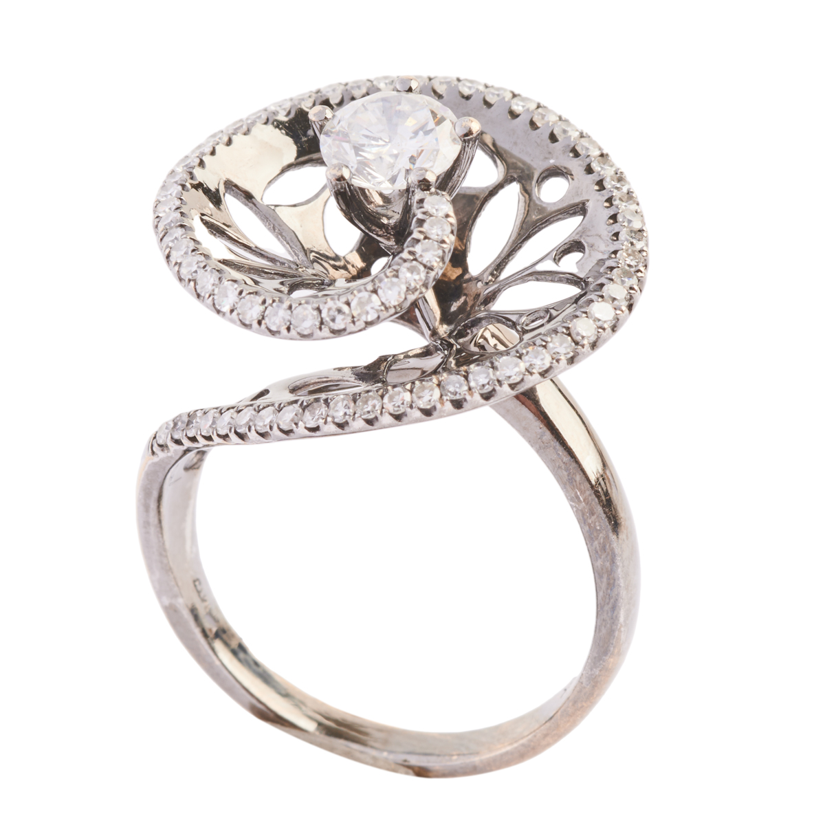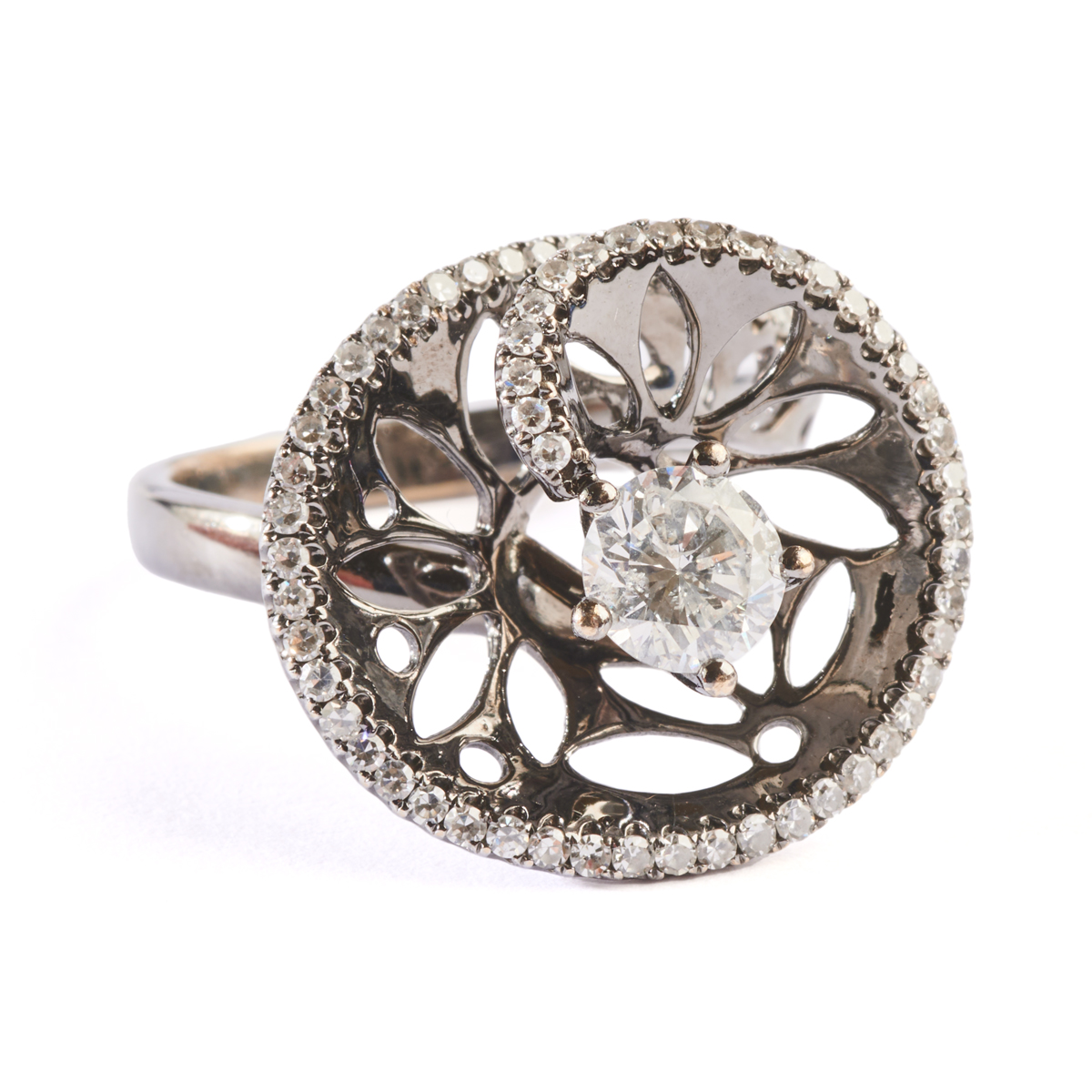 Featuring one round brilliant-cut diamond weighing approximately 0.65 ct., accented by sixty-five single-cut diamonds weighing a total of approximately 0.40 cttw., set in an oxidized 18k white gold mounting.