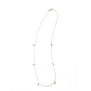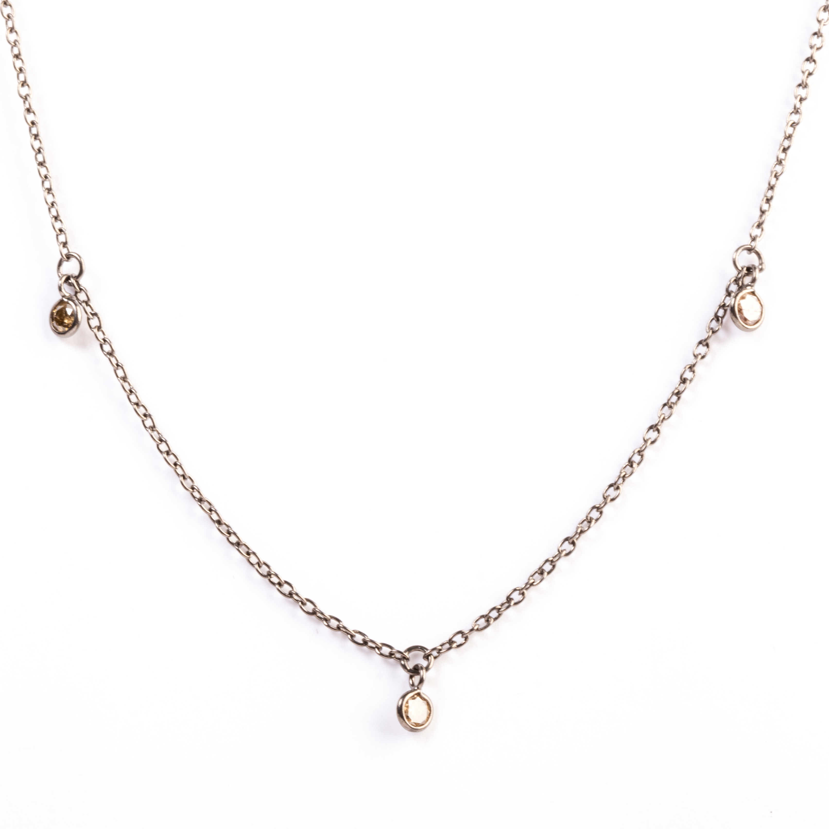Featuring six full-cut diamonds, bezel set and suspended from an oxidized silver chain, forming an 18 inch necklace.