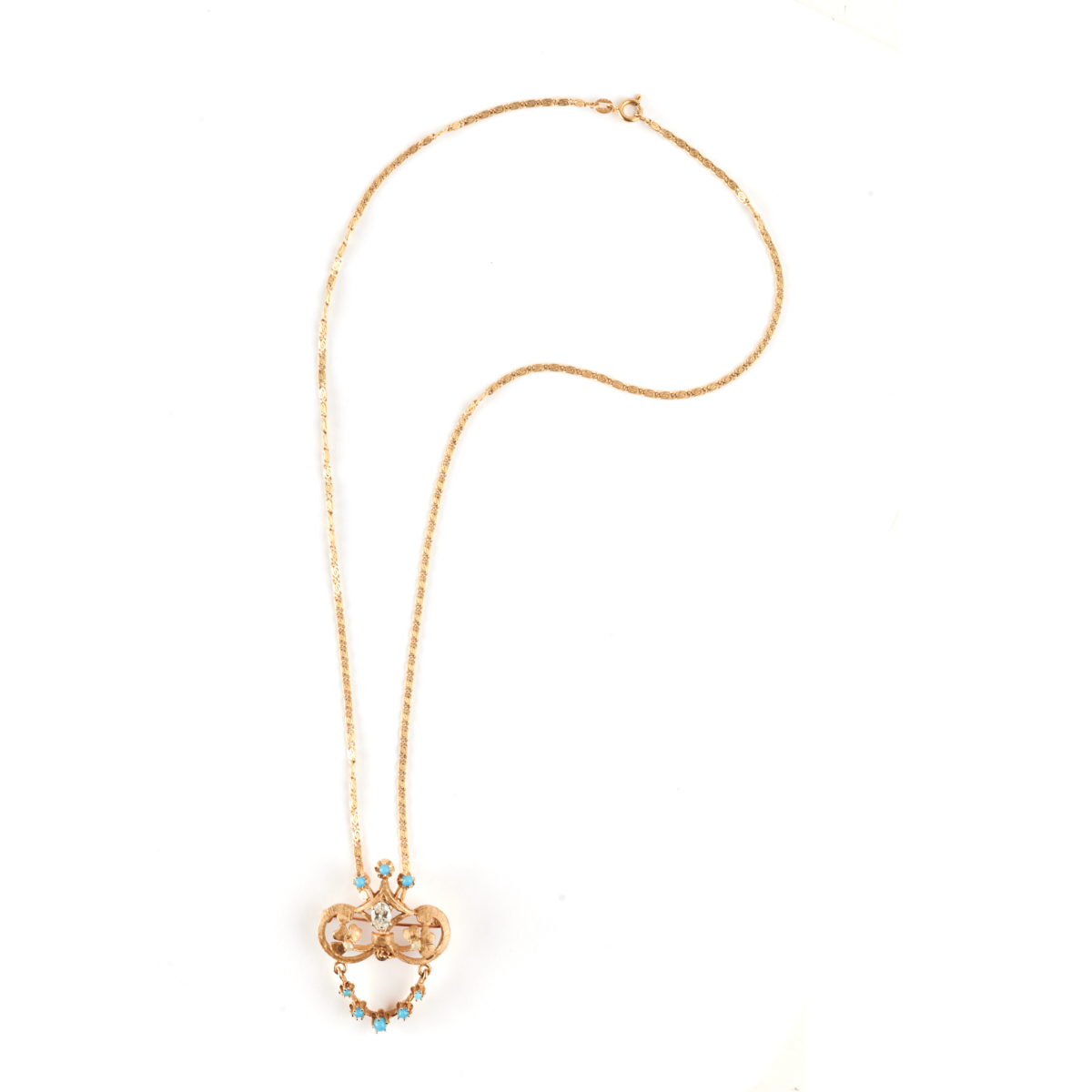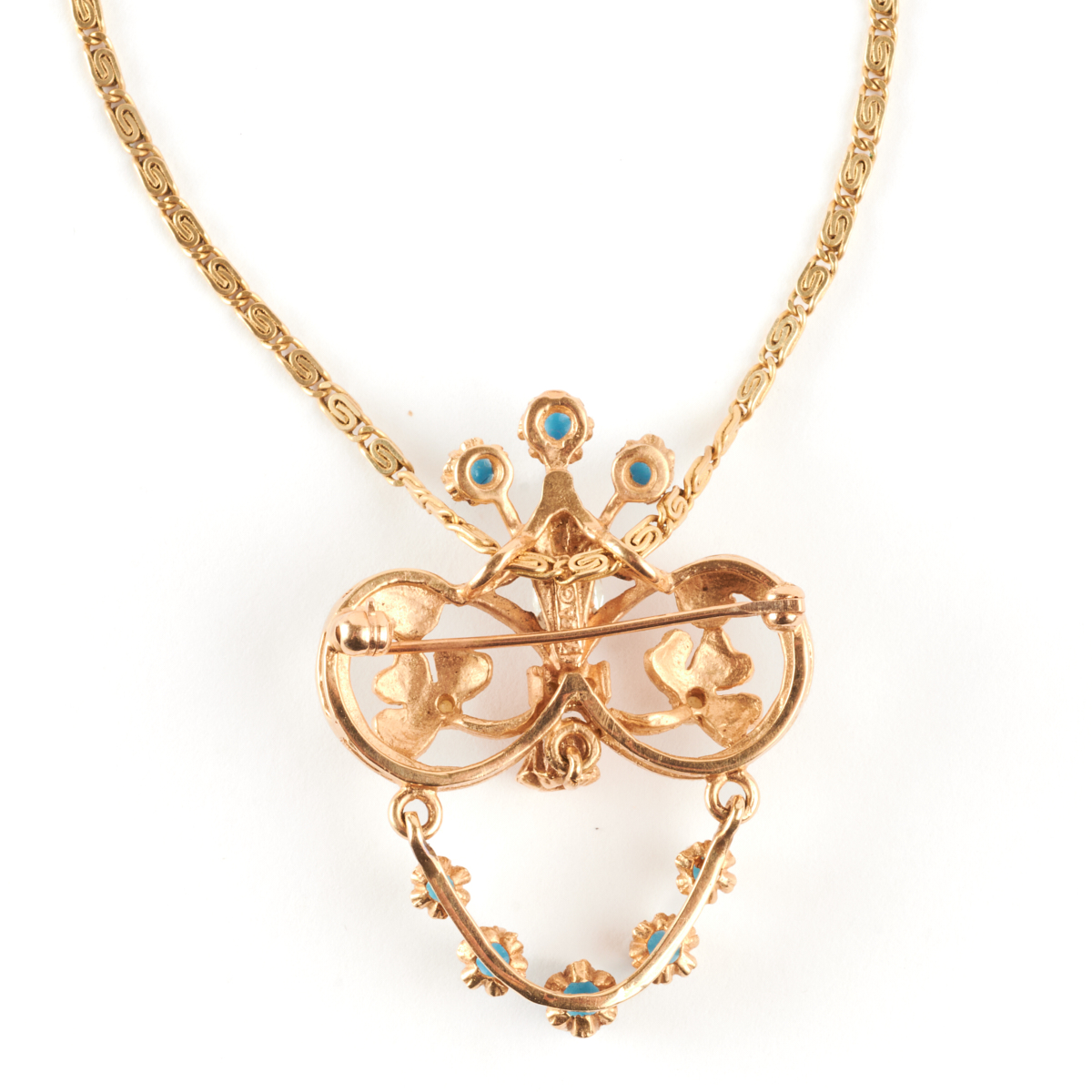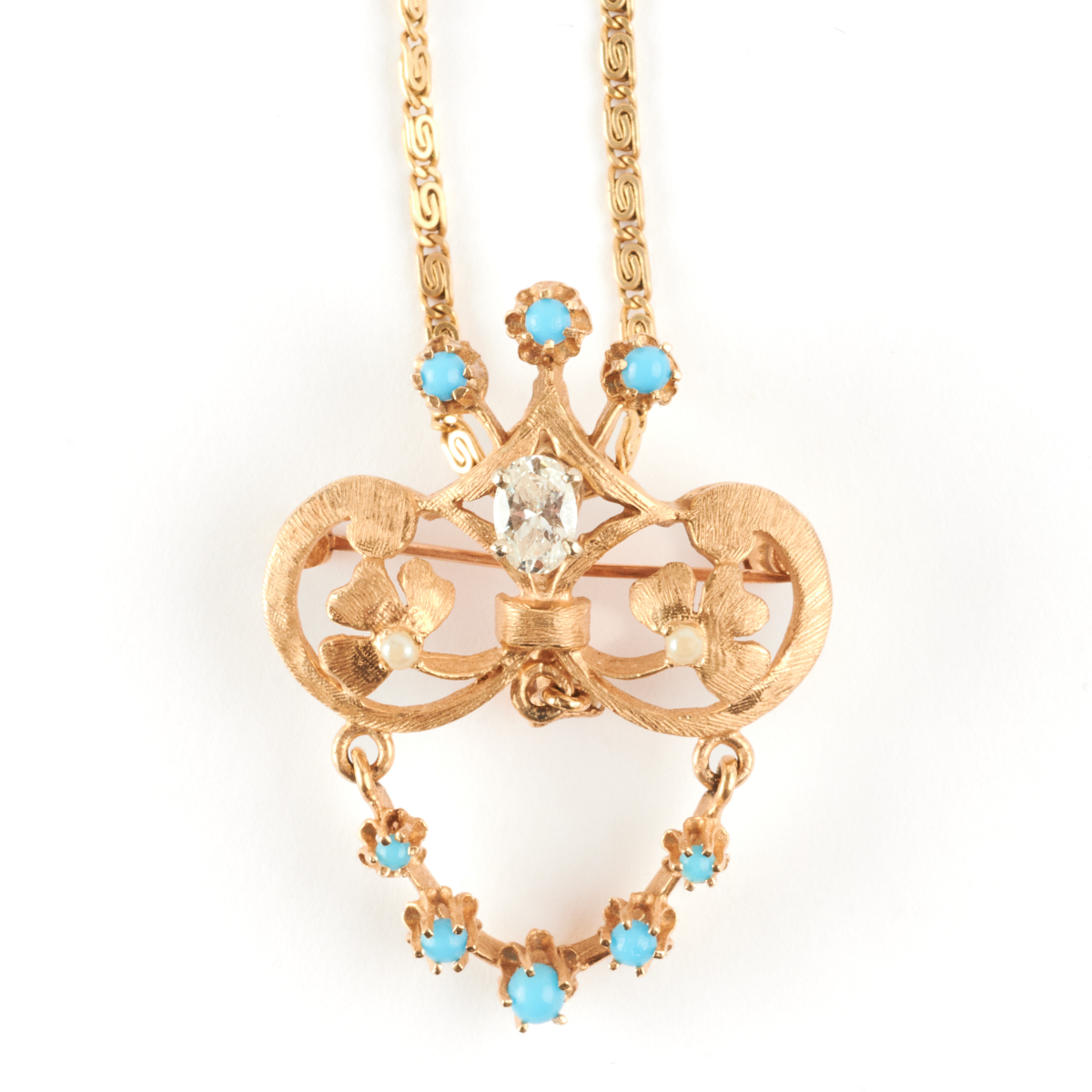 Featuring one oval-cut diamond weighing approximately 0.50 ct., accented by one full-cut diamond weighing approximately 0.06 ct., further enhanced by round shaped turquoise cabochons, set in a 14k yellow gold articulated pendant brooch mounting measuring approximately 39 x 30 mm, suspended from a 14k yellow gold chain, forming a 20 inch necklace.