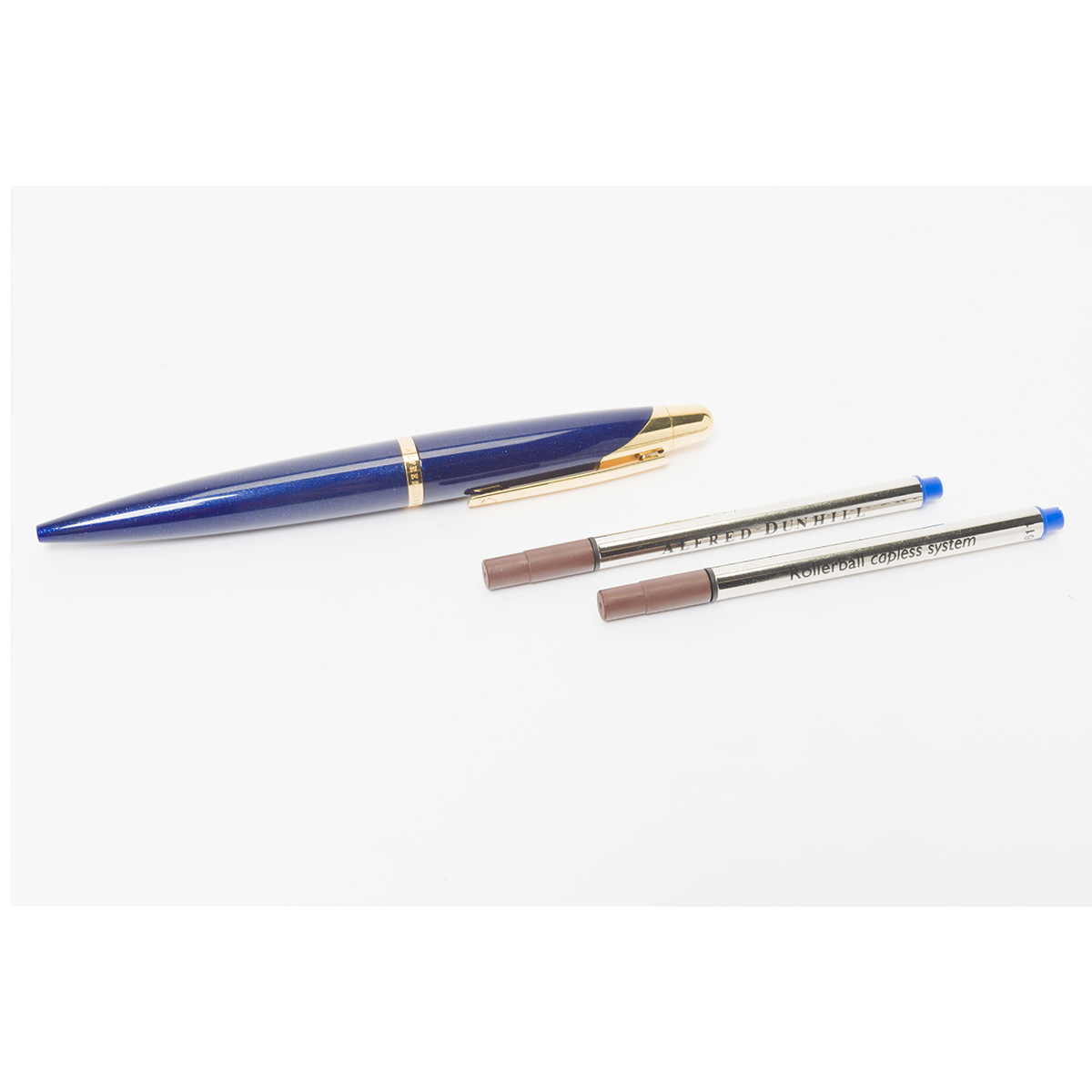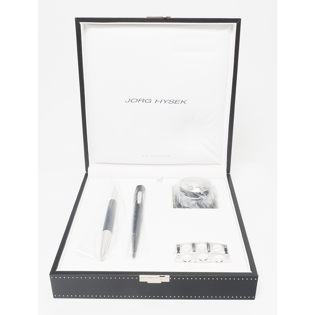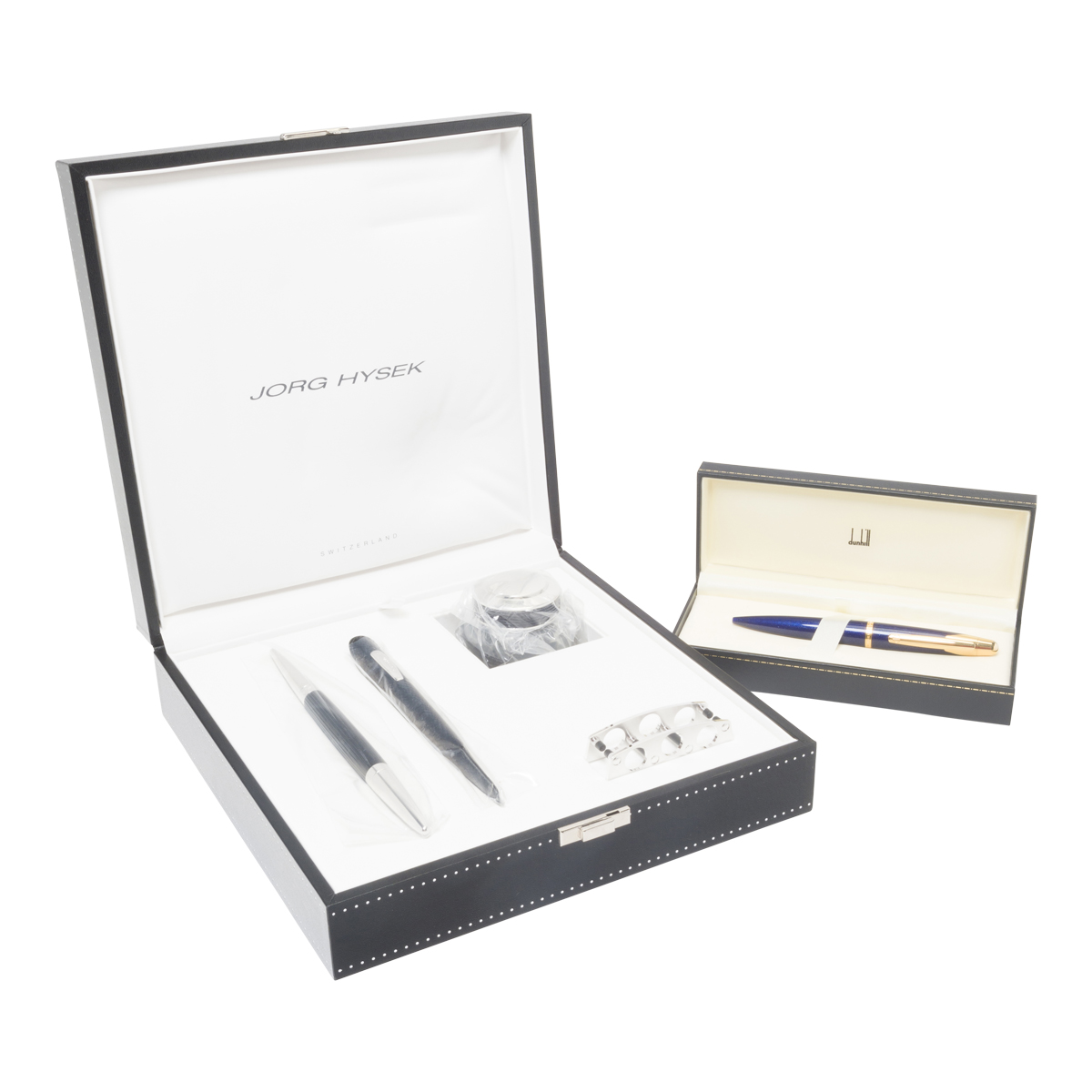 Comprising blue and gold Dunhill DNY-240 with original packaging and Jorg Hysek boxed fountain pen set comprising pen, leather seath, inkwell, and pen rest.