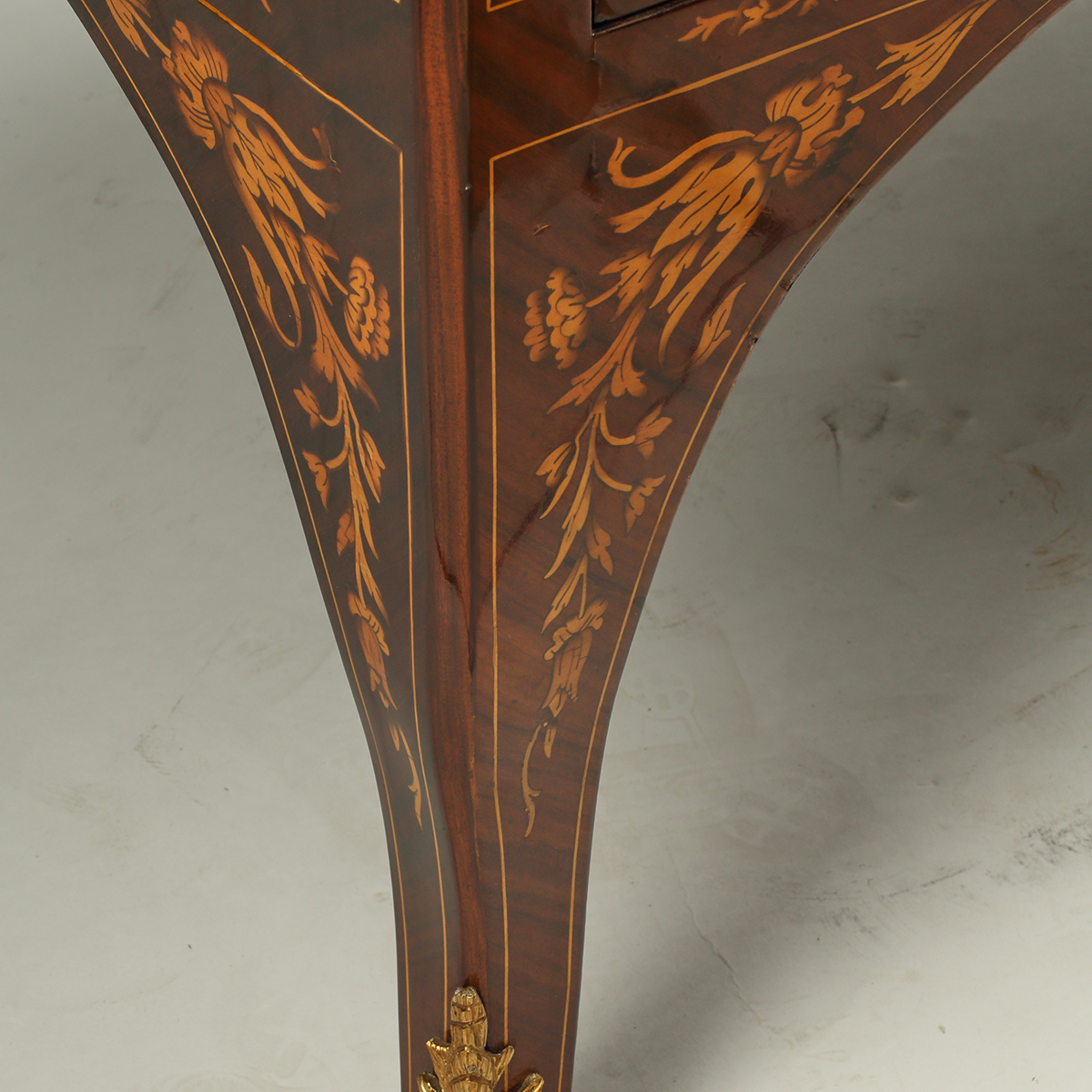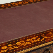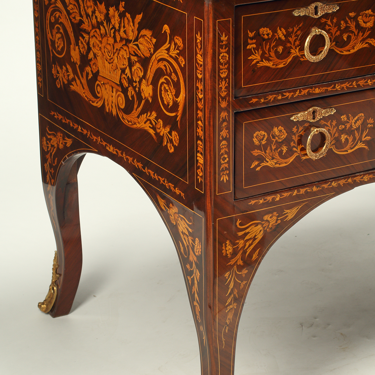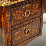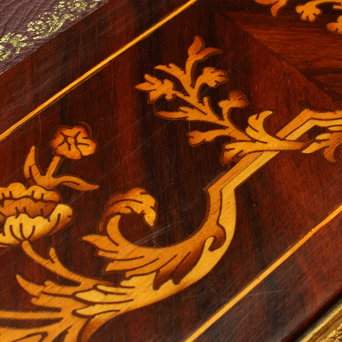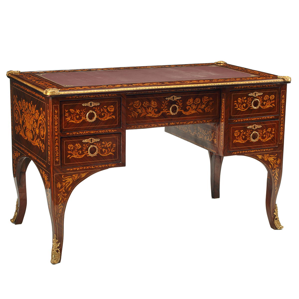 Inset red leather top, central drawer flanked by two short drawers on either side, cabriole legs floral marquetry inlay throughout, gilt metal mounts.