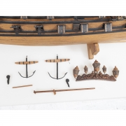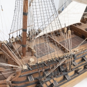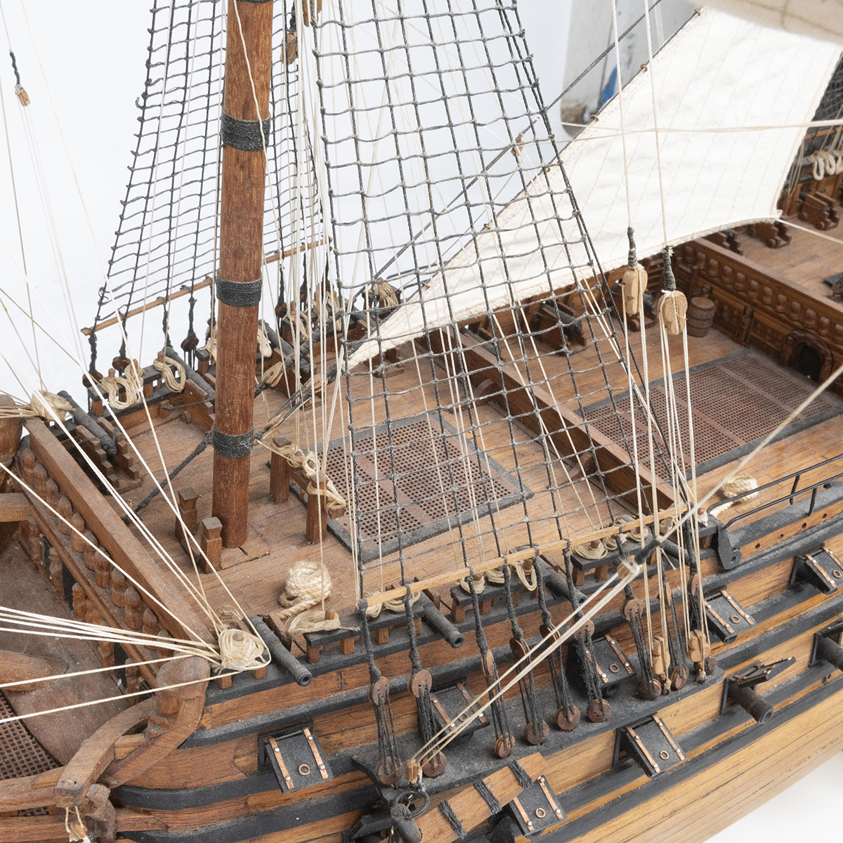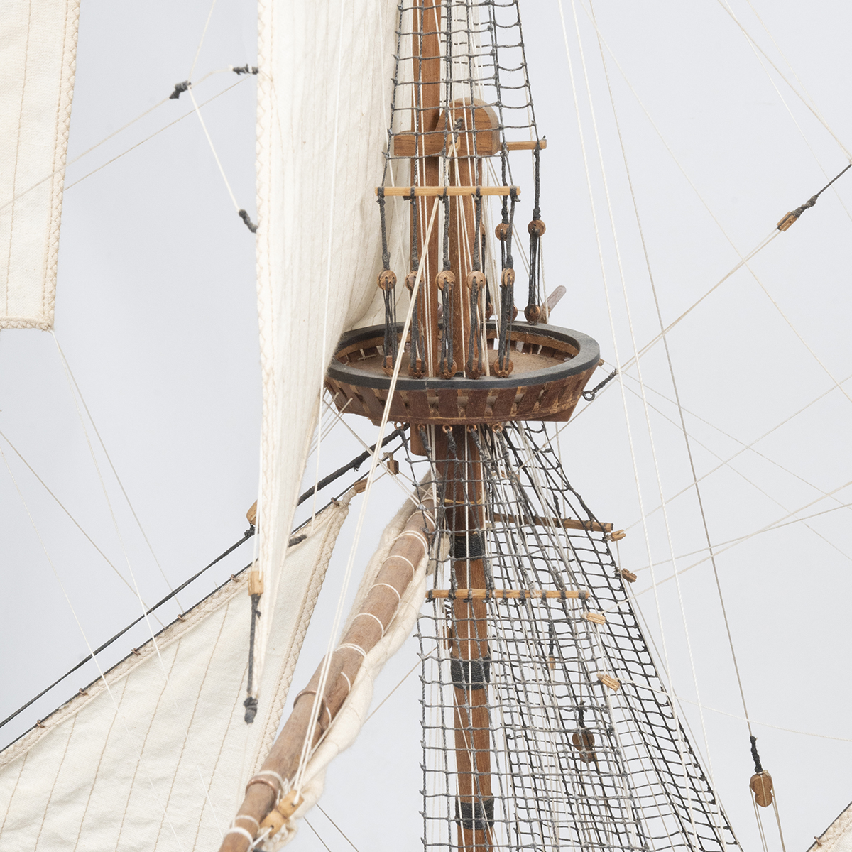 The wood model ship with linen sails, the ship resting on base.