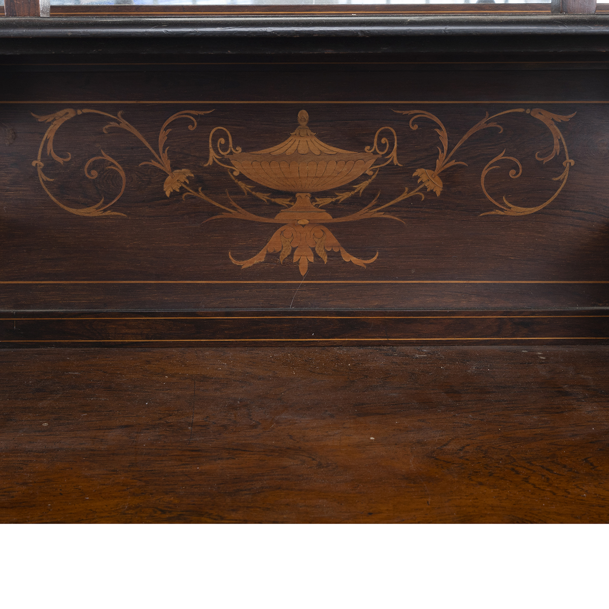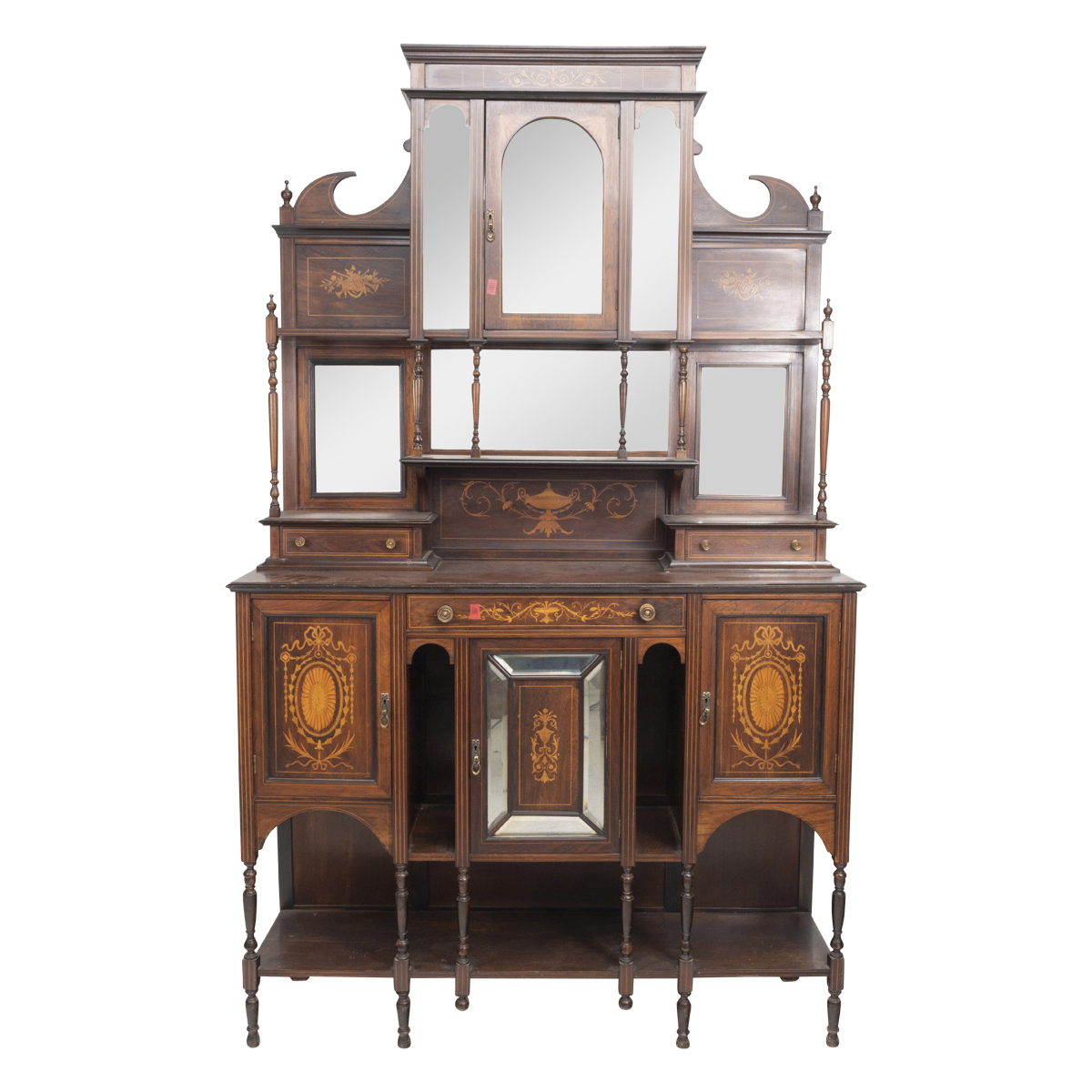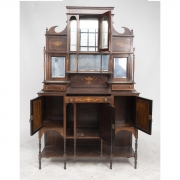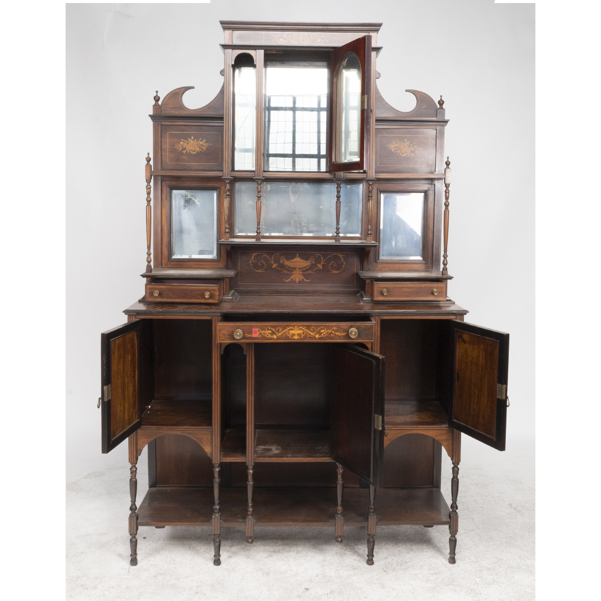 The top section with single door cabinet, shelf spaces, mirrored panels, two small drawers the base with central drawers, three single door cabinets, shelf spaces inlaid trim and panels throughout.