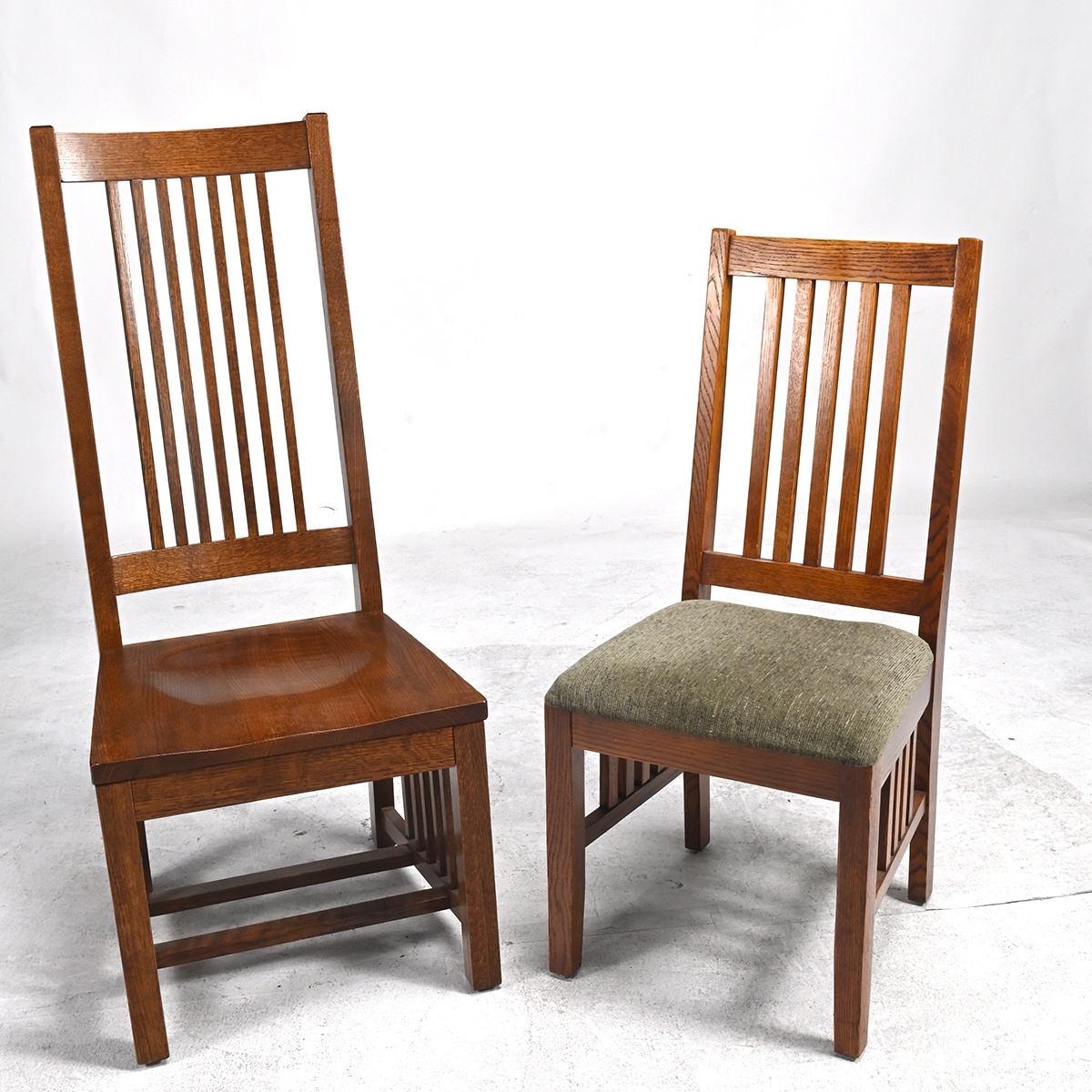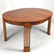 Comprising a dining table with two leaves, four side chairs with green upholstered seats, and high back side chair.