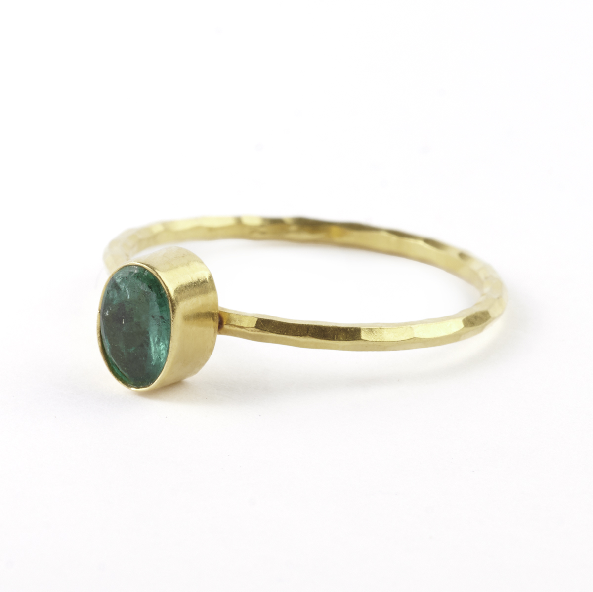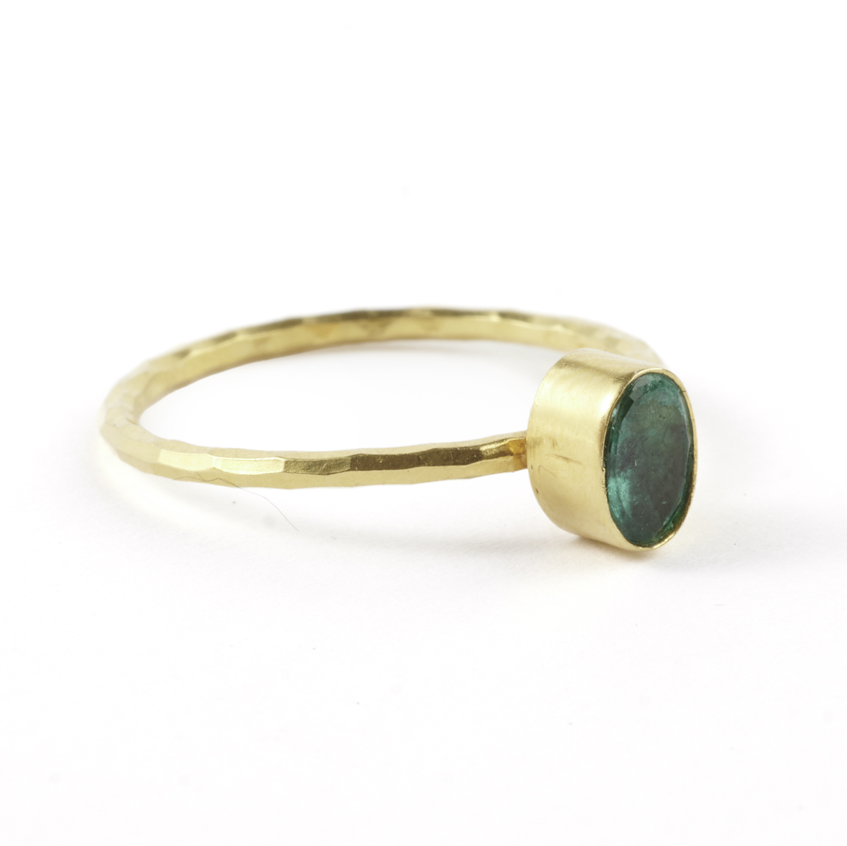 Featuring one oval-cut emerald, bezel set in an 18k yellow gold mounting with textured shank.