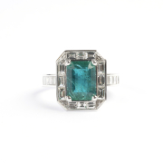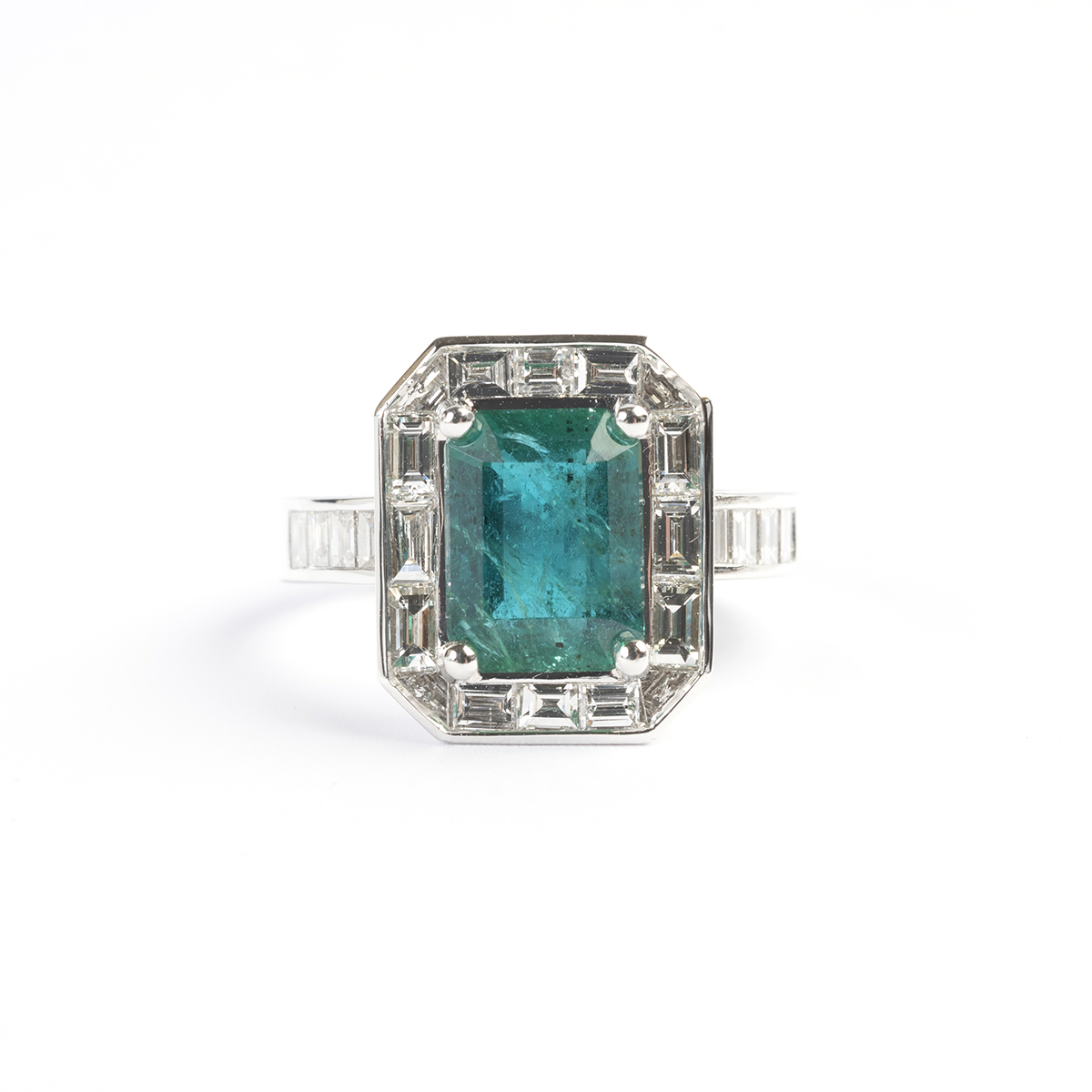 Featuring one emerald-cut emerald weighing approximately 2.30 cts., accented by twenty-four baguette-cut diamonds weighing a total of approximately 1.05 cttw., set in an 18k white gold mounting.