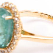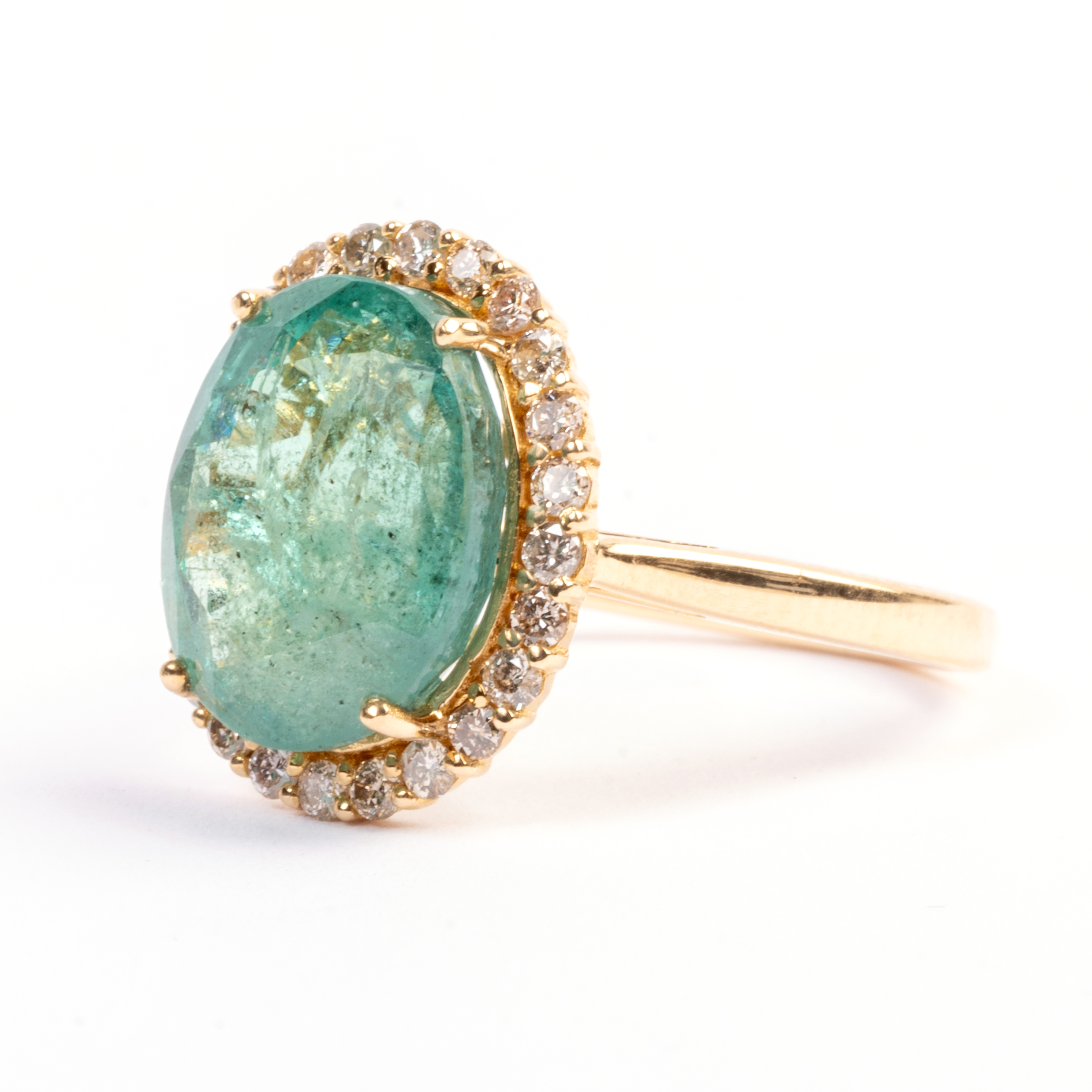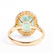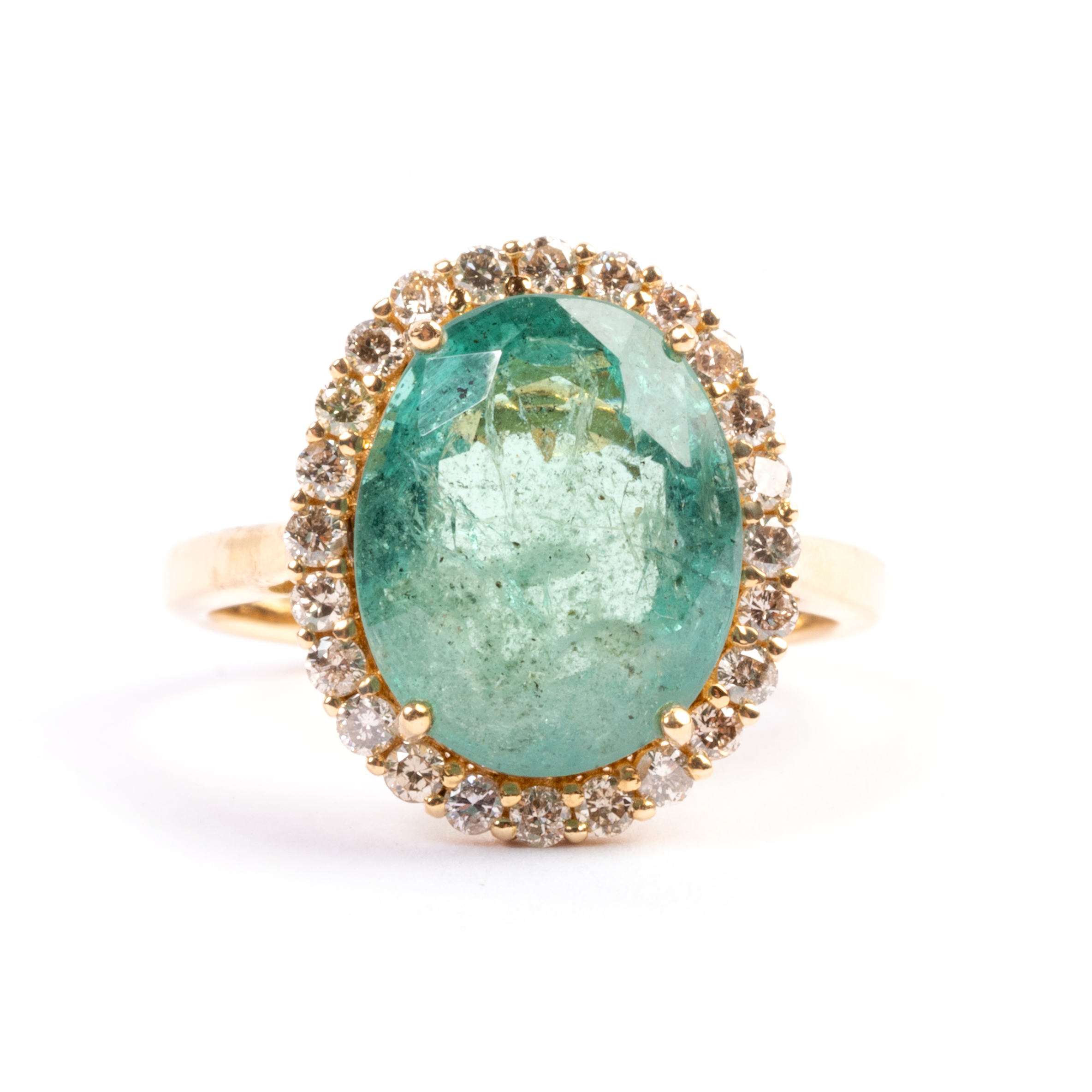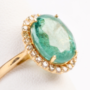 Featuring one oval-cut emerald weighing approximately 5.40 cts., accented by round-cut diamonds weighing a total of approximately 0.35 cttw., set in an 18k yellow gold mounting.