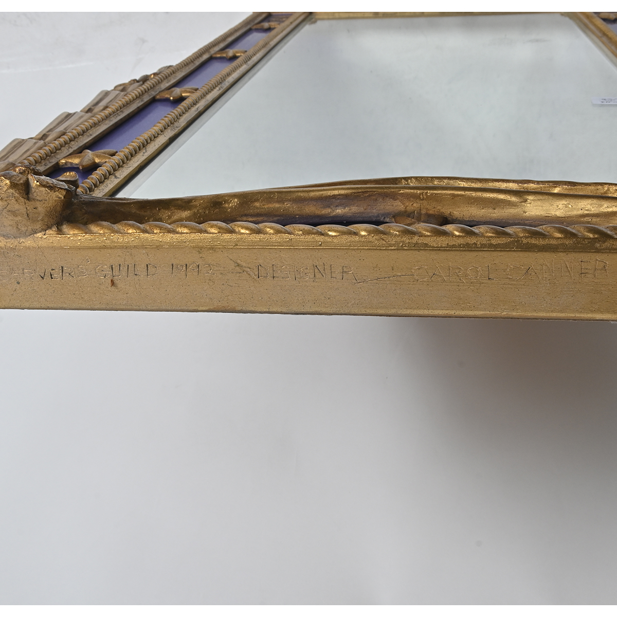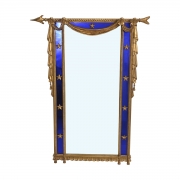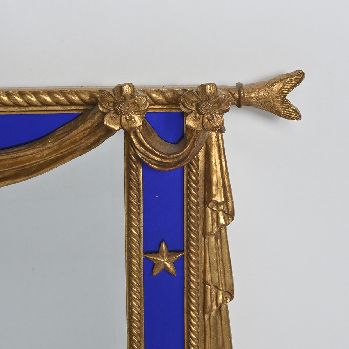 The frame with swag hung across the top draping down the side and blue glass band accented with gilt stars, beveled mirror.