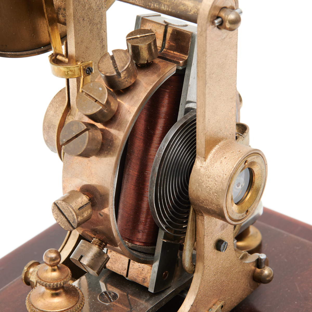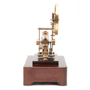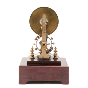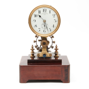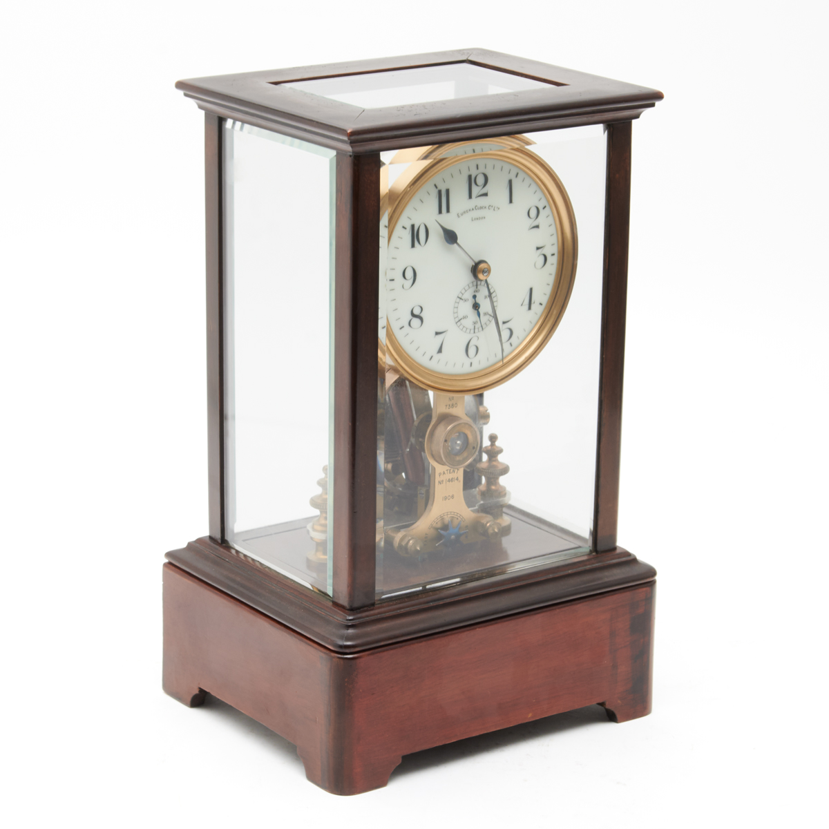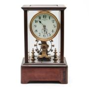 Mahogany case with beveled glass panels, white dial with Arabic numerals, powered by weighted magnetic impulse wheel, battery housing to the underside.