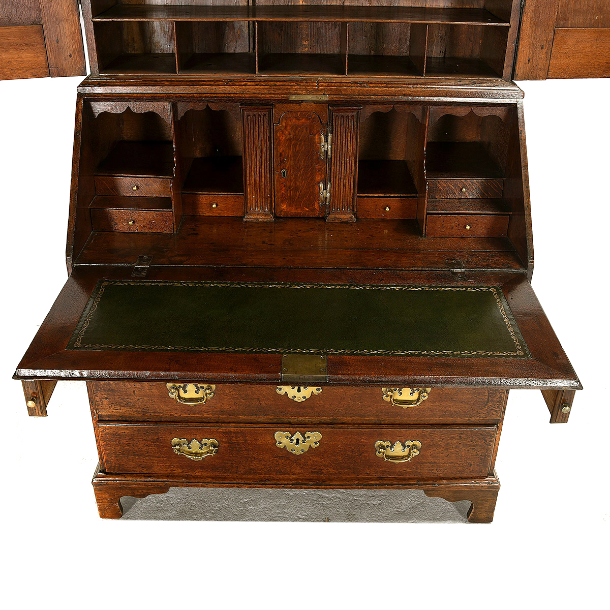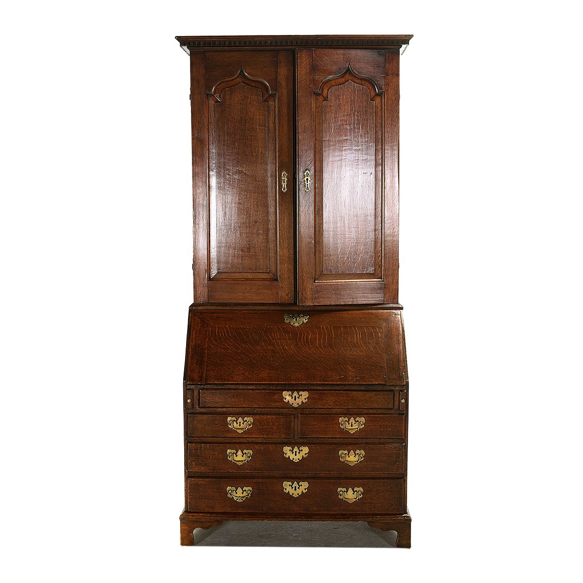 The upper cabinet doors carved with arch door panels, over the drop front desk concealing an inset green leather writing surface and several small drawers and compartments, set above a shallow long drawer with two short beneath and two graduated long drawers below, all supported by bracket feet.