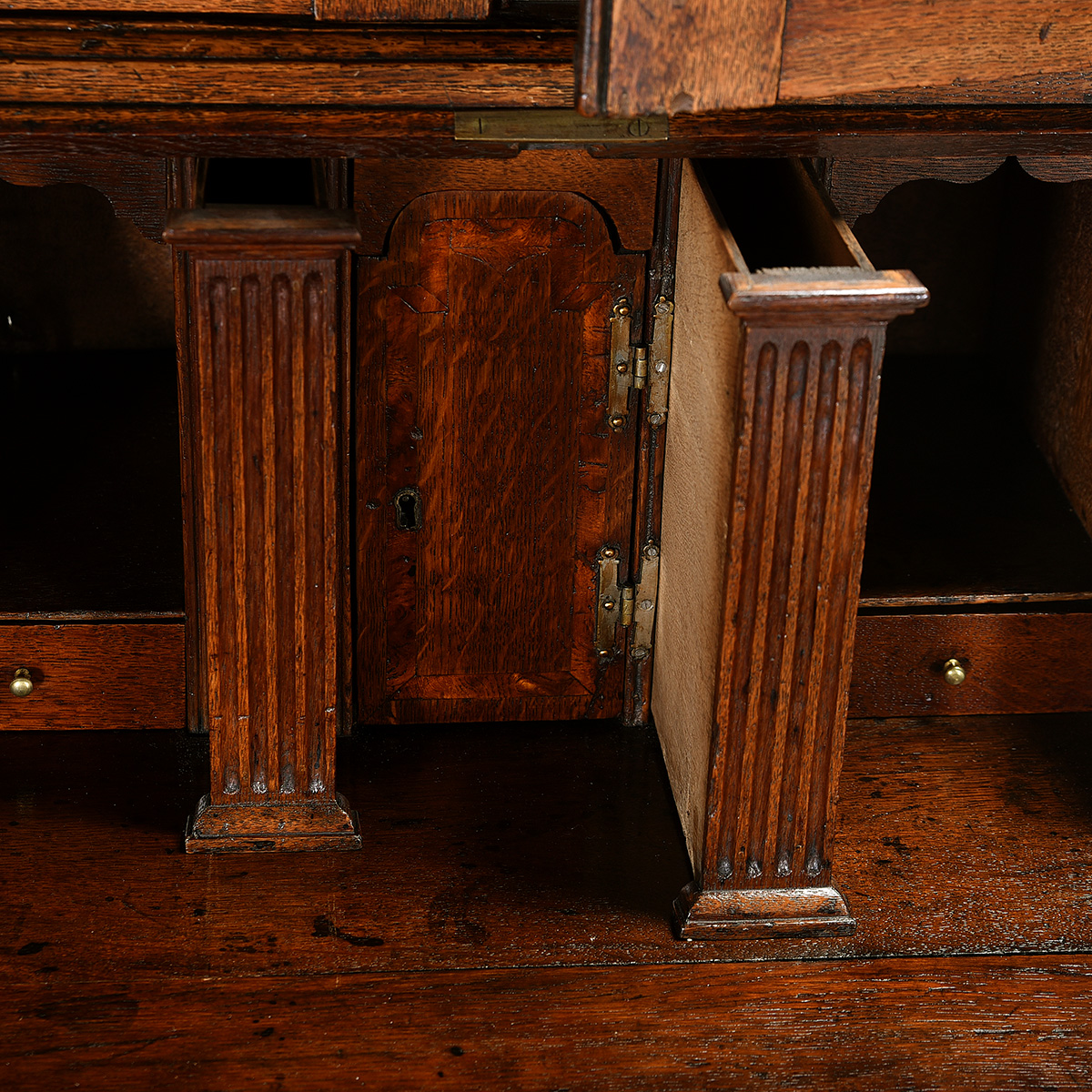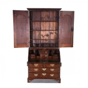 Condition: Repair to carving on the door panel. Later brasses. The central compartment in the desk doesnt open with any of the provided keys. Moderate wear overall but good condition for age.