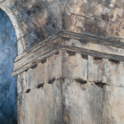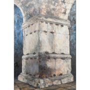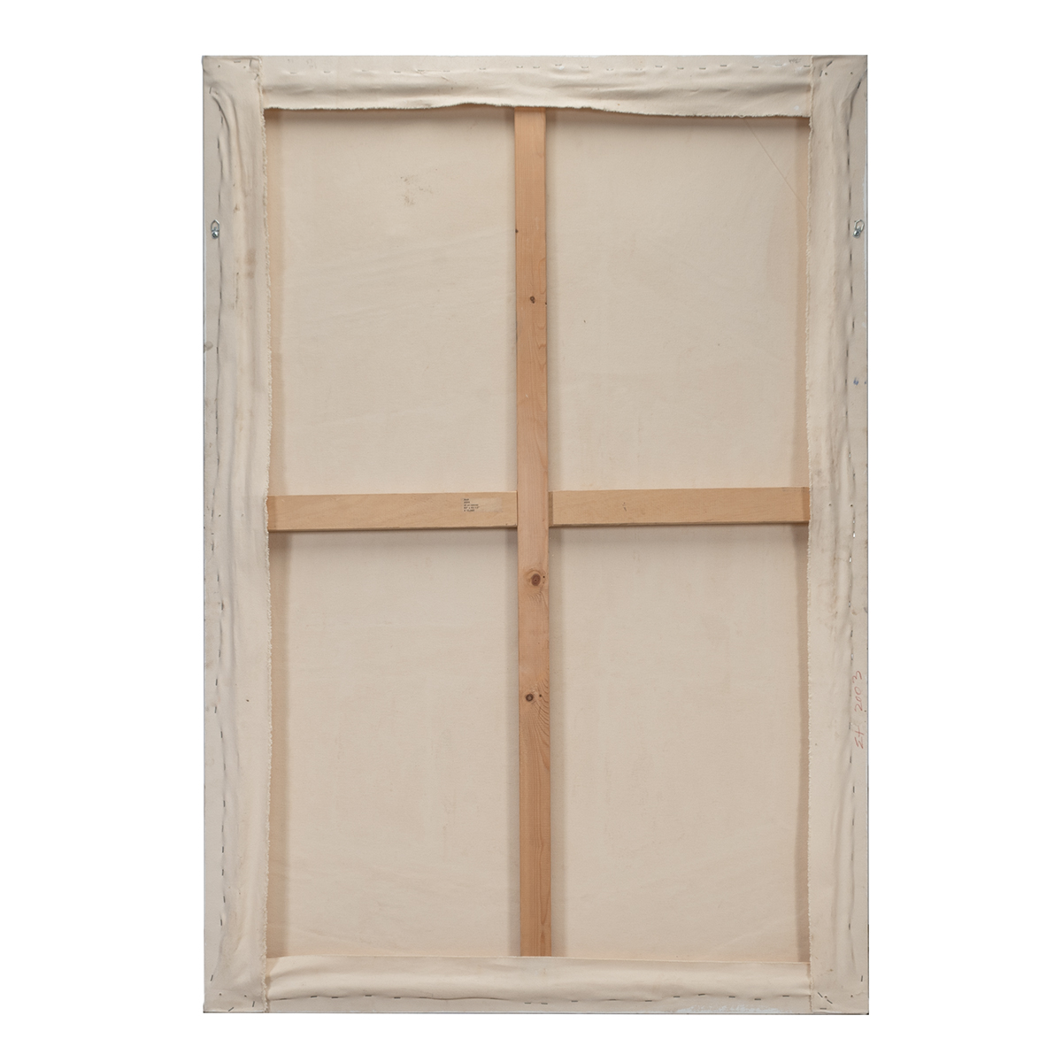 titled, dated, medium, and dimensions on label adhered on stretcher bar verso.