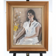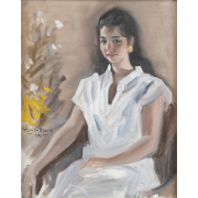 Provenance: Renowned Philippine designer Leila T. Larkin had the privilege of being a cherished friend of the renowned artist, Federico Aguilar Alcuaz. Their bond was so strong that they were bestowed with the extraordinary honor of being subjects of Alcuazs masterful paintings. This painting of Manila socialite, Doa Letty del Rosarios granddaughter, has remained with and cherished within the family since its creation.