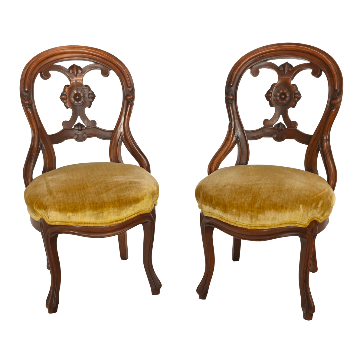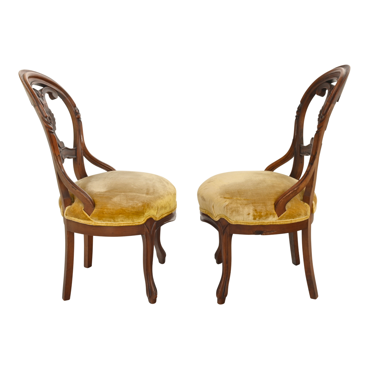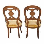 Condition: The frames with appropriate good surface condition considering age. Repair to wood under one seat. Repairs where back meets the side supports, with some resulting loss. Repair to one crown rail. Upholstery with fading.