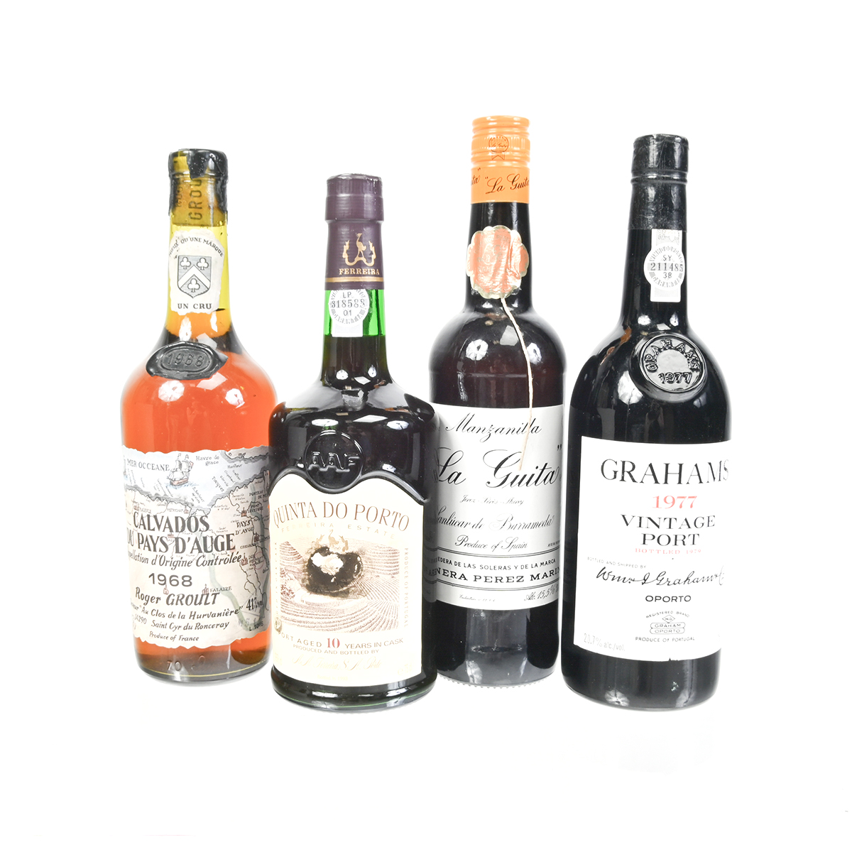 Comprising 1993 Quinta do Porto Ferreira Estate 10 year cask aged port, 1977 Grahams vintage port bottled 1979, 1968 Roger Groult Calvados du Pays DAuge Appellation dOrigine Controlee, Manzanilla La Guita Sanlucare de Barrameda sherry.