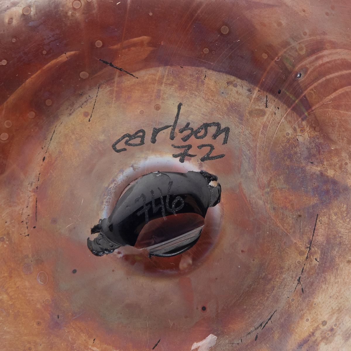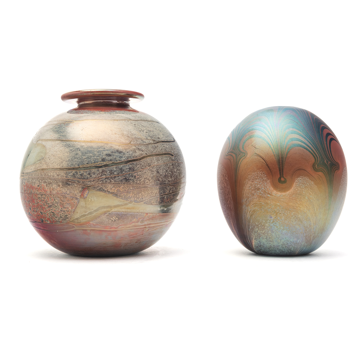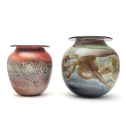 Comprising globular form with everted rim in green and blue, signed carlson 71 globular form with everted rim in red and green, signed carlson 71 short tapered vase with wide mouth and everted rim in red and blue, signed carlson 72 egg form with narrow mouth in red, signed carlson nu73x 2236.
