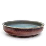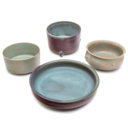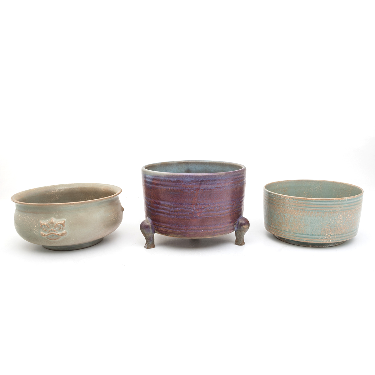 Comprising a celadon glazed censer with molded beast head decorations, a celadon glazed cylindrical bowl, a Jun-type tripod incense burner, and a Jun-type brush washer.