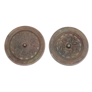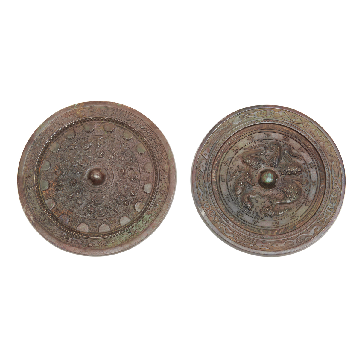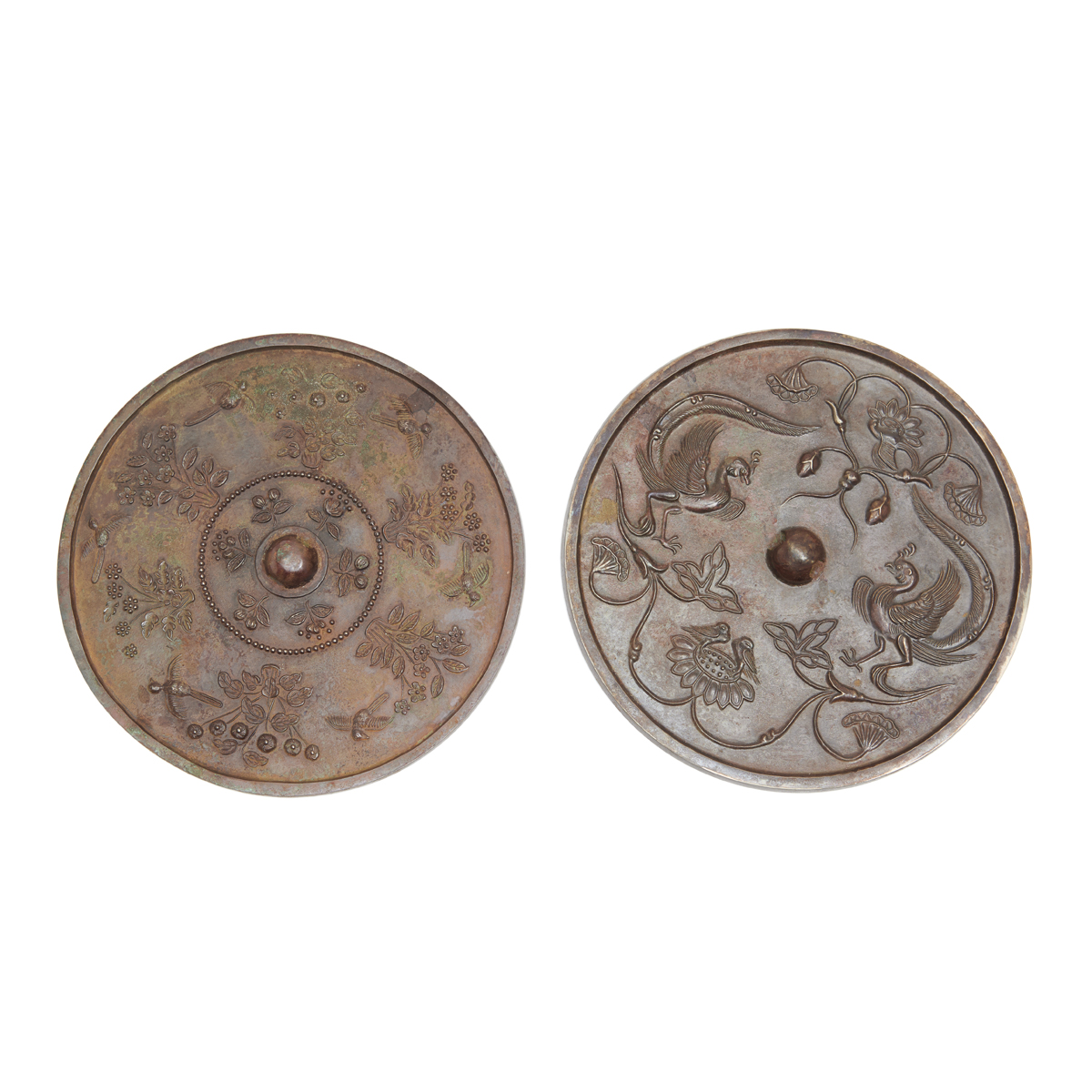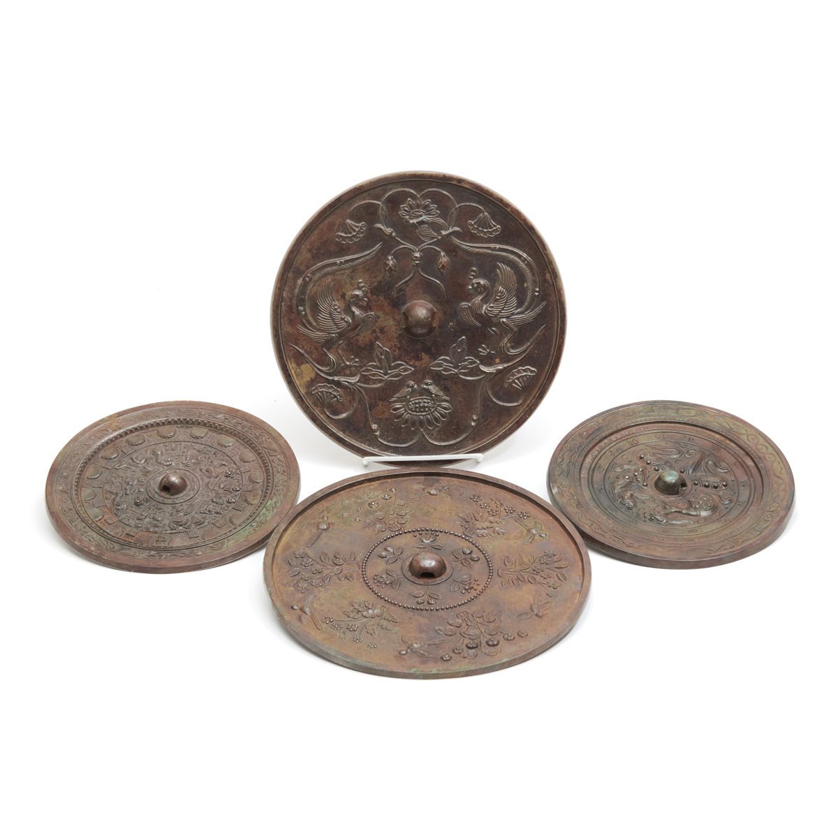 Each of round shape cast in low relief on one side with a phoenix, birds, flowers, and mystical beast motifs around the central dome, two further decorated with a band of stylized petals and patterns at the rim.