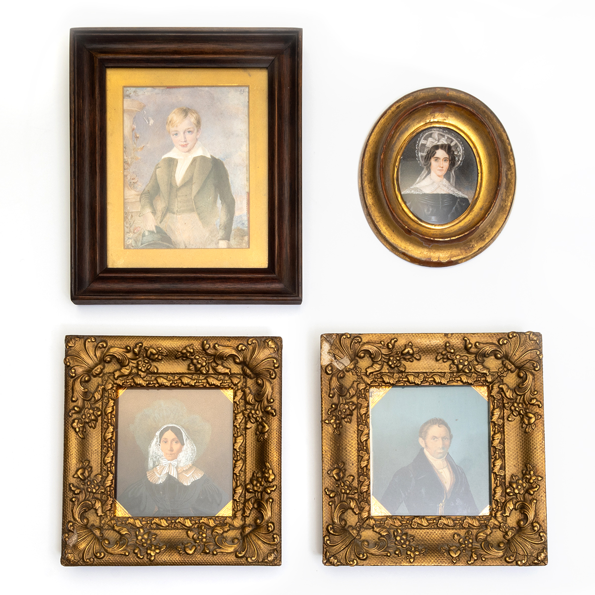 Comprising woman in black dress with white lace collar and white hair, giltwood oval frame blonde boy posing by urn holding hat in later frame two portraits in matching giltwood frames with male on blue ground signed Meister 36 lower right, and woman wearing black dress and white lace bonnet on dark red ground signed E Meister 1832 lower left.