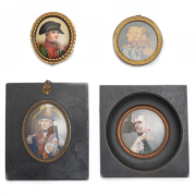 Comprising Napoleon portrait signed indistinctly to the right, Horatio Nelson portrait signed indistinctly to the right, double portrait of high ranking Russian military officers, portrait likely depicting Napoleon in green and red coat.