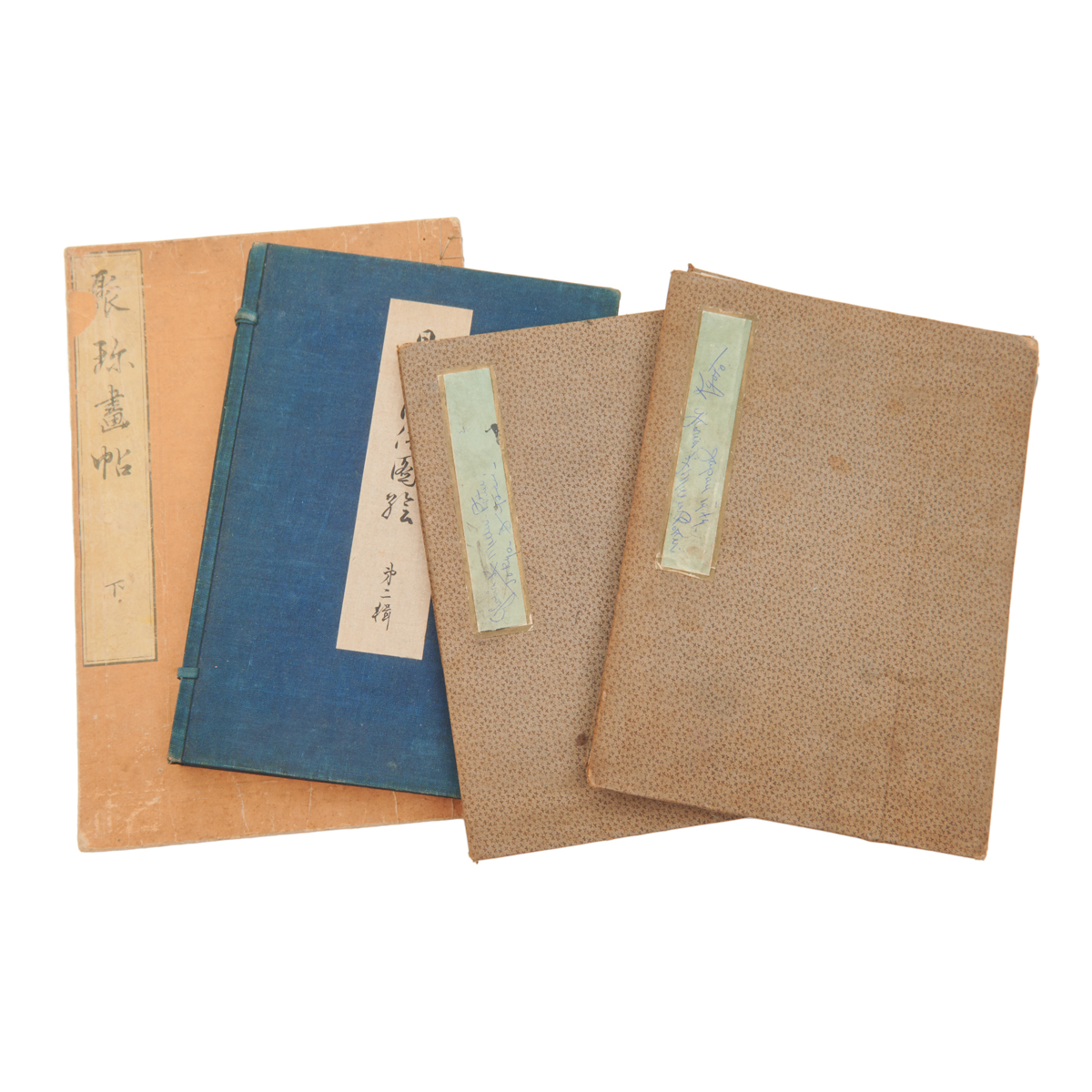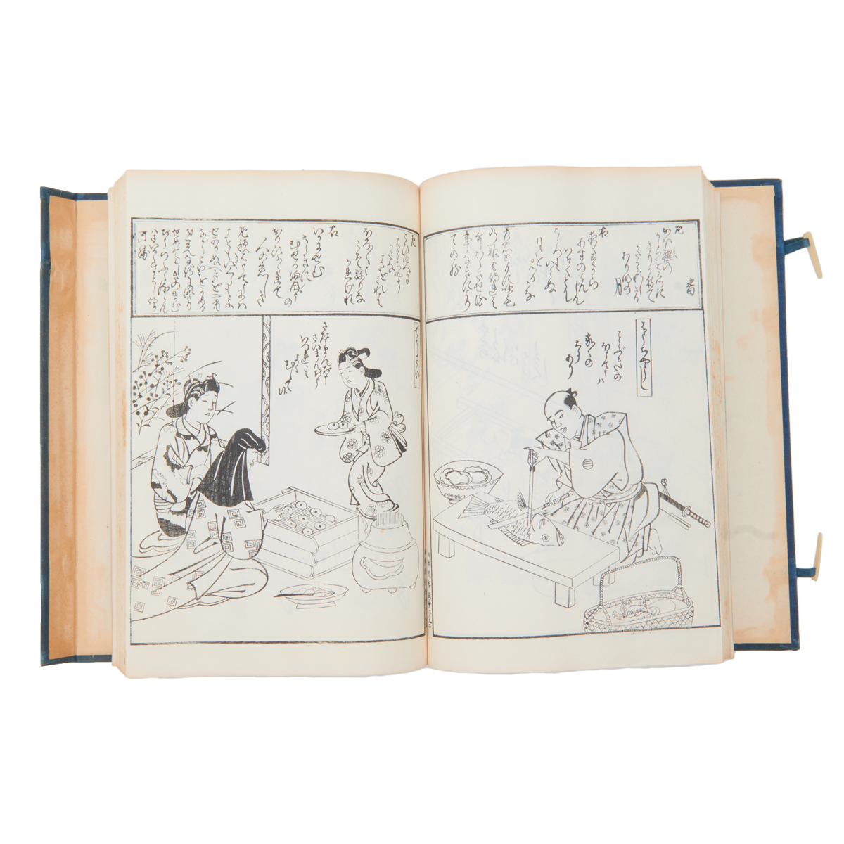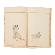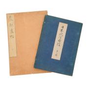 Comprising: a string-attached Nihon F zoku Zue volume 2, woodblock prints by Hishikawa Moronobu, ink on rice paper a string attached Fine Paintings Album volume 2, published in 1803 spring two woodblock print albums mounted in an accordion-fold album, with fabric hard covers.