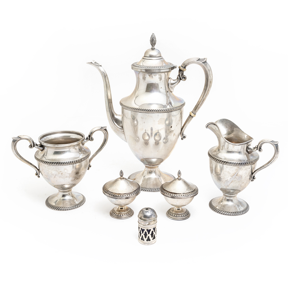 Approximate weighable silver: 1,104 grams. Approximate dimensions: Coffee pot 10 3/4 high.