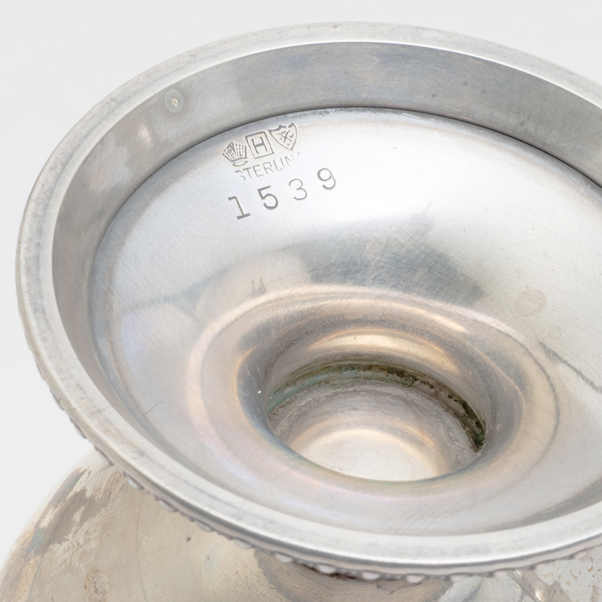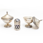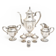 Coffee set comprising coffee pot, creamer, and sugar additional items comprising pair of .800 silver covered salt cellars with glass inserts and monograms to covers, small silver-plated bottle with blue glass insert.