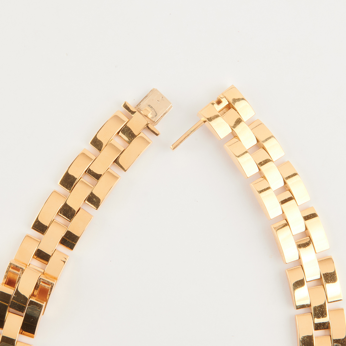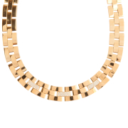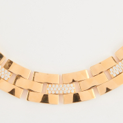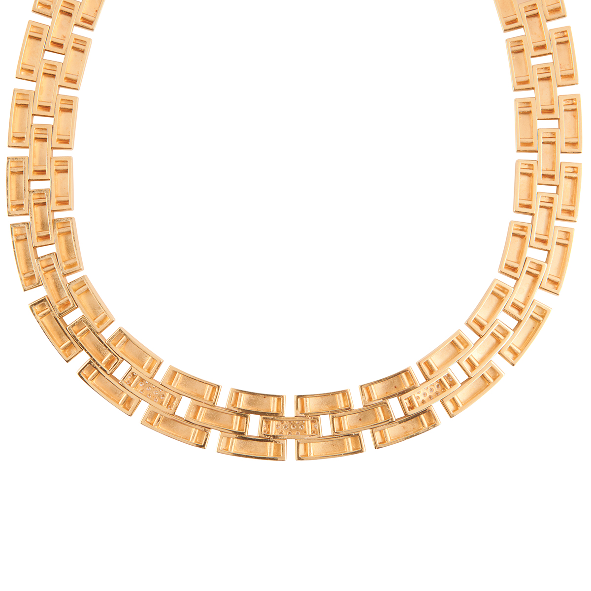 Featuring sixty-six full-cut diamonds weighing a total of approximately 1.05 cttw., set in an 18k yellow gold brick link mounting measuring approximately 18 mm in width, completed by a tongue and groove clasp with fold under safety, forming a 16 inch necklace.