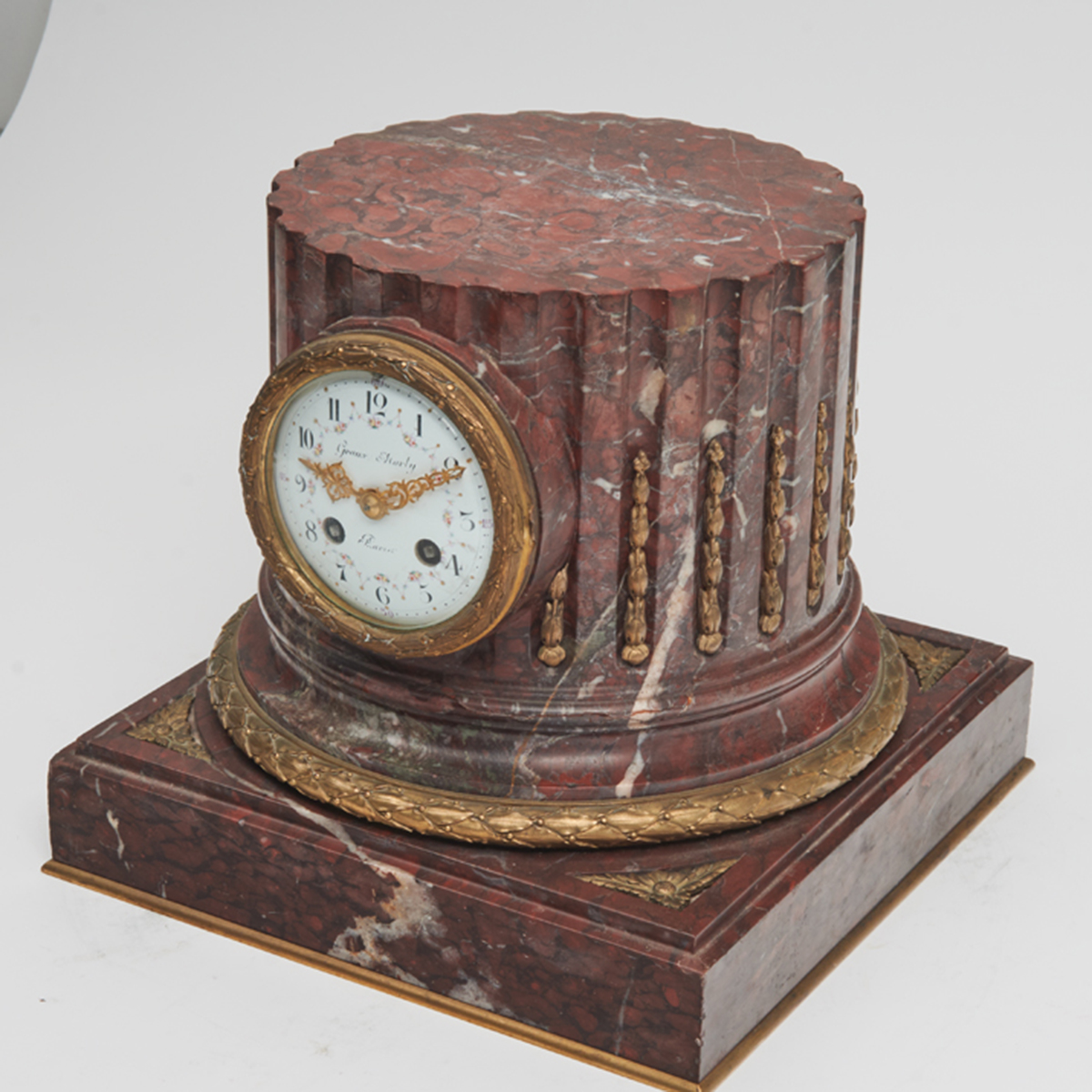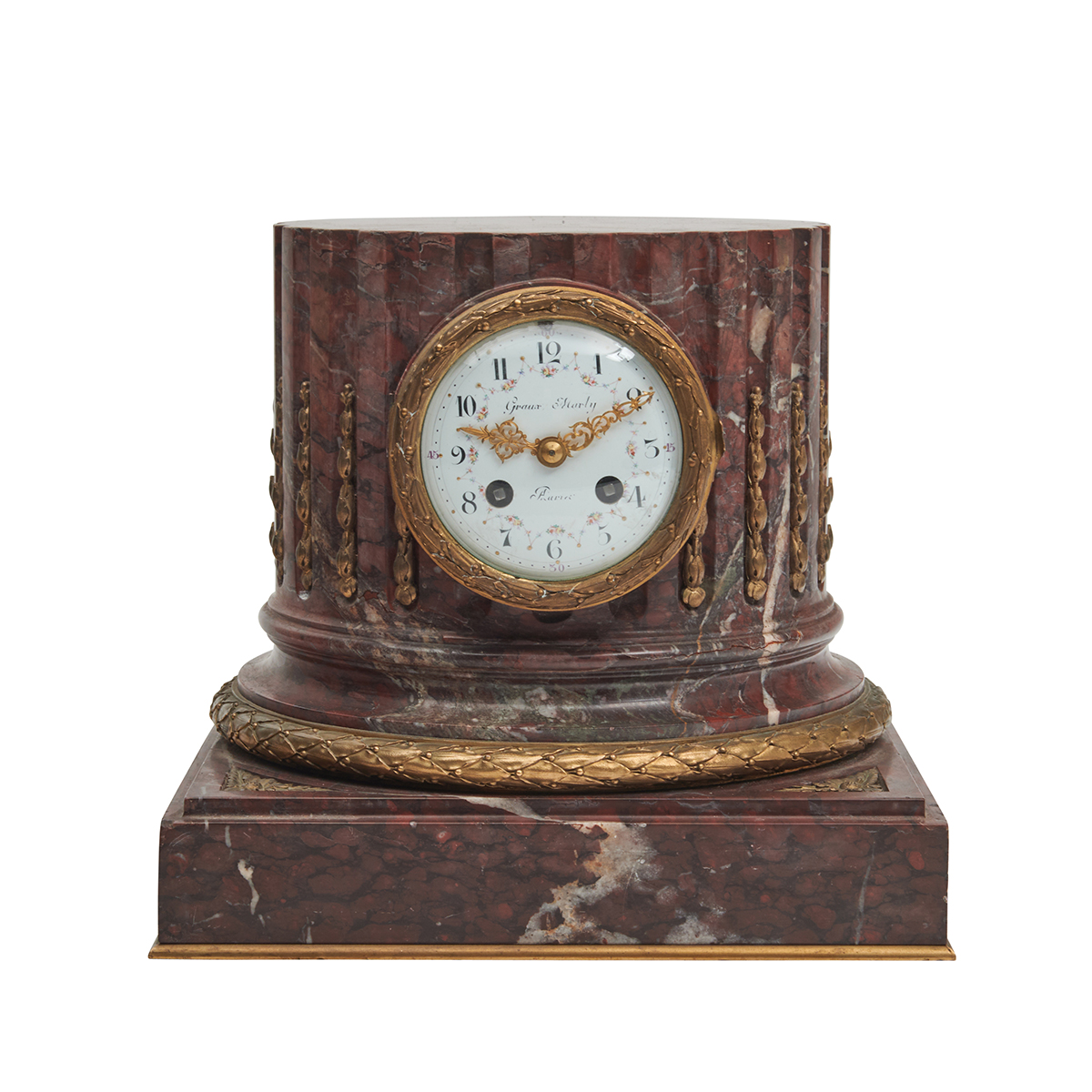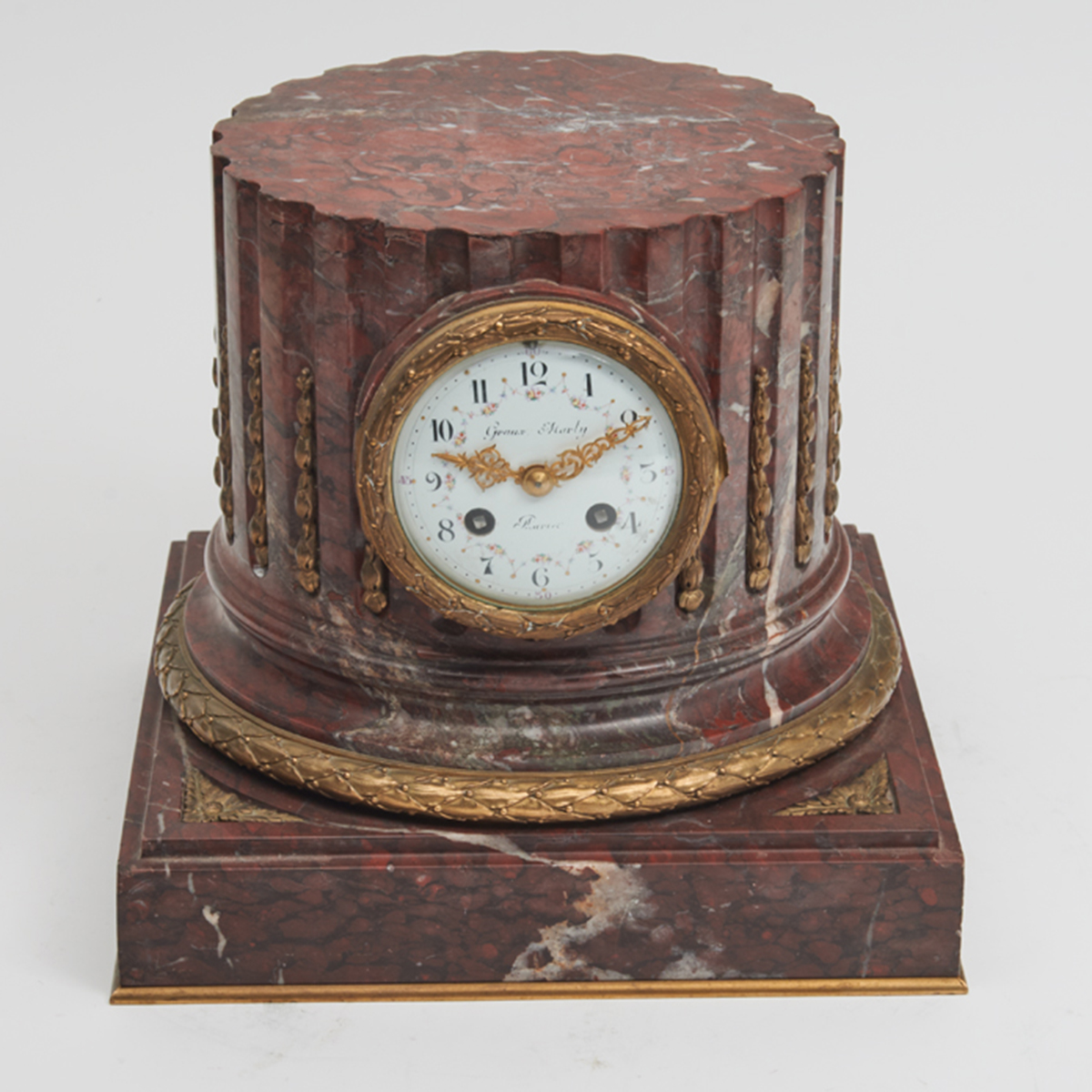 Columnar form clock with gilt bronze mounts, the dial with Arabic numeral markers and painted with floral swags.