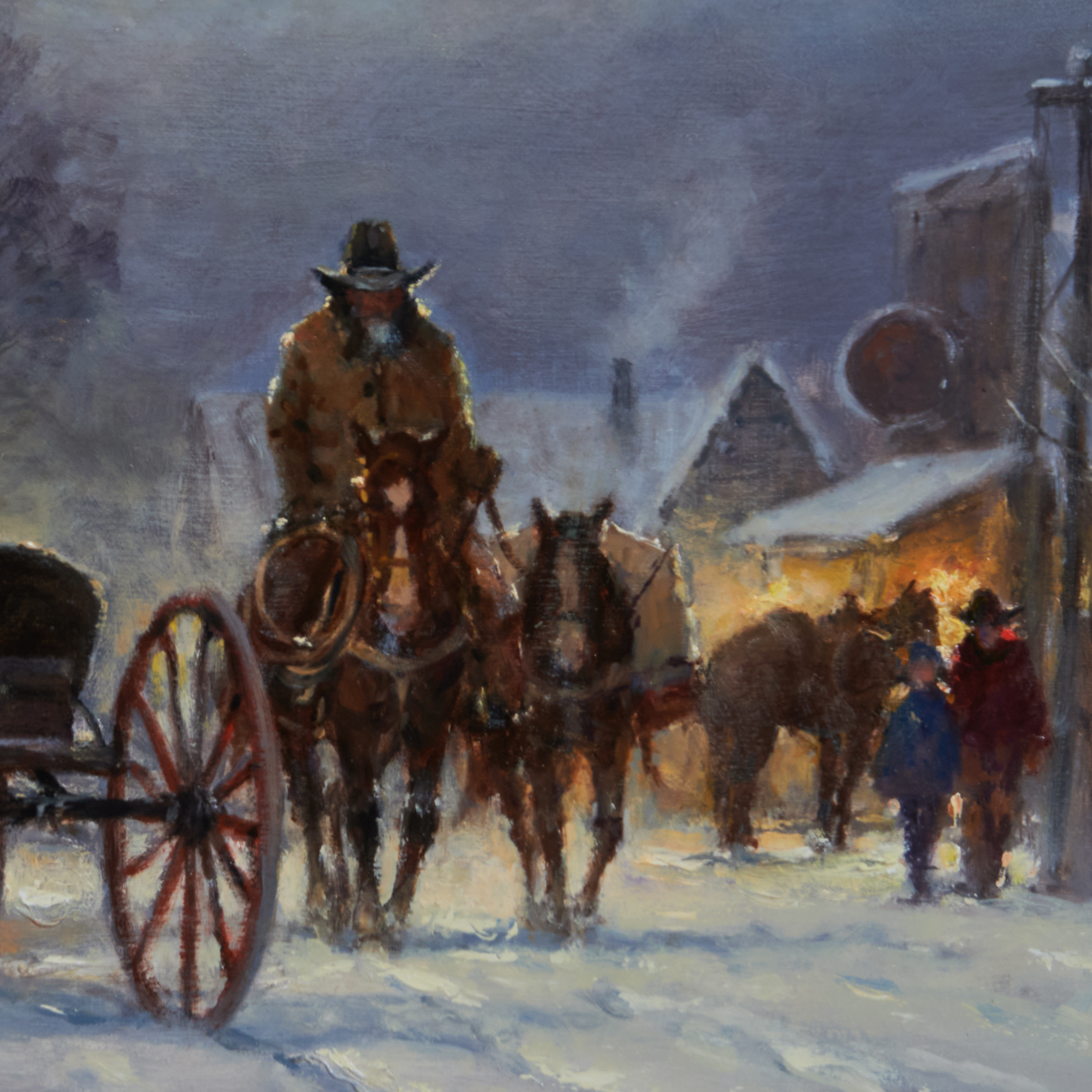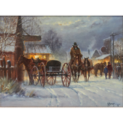 Notes: Frame has light wear, approximate dimensions - framed: 22-3/4 x 26-5-/8 inches. Bio: The artist studied industrial design at the University of Northern Texas, embarking on a career in teaching, while also pursuing his making of art. Influenced by artists such as Hassam, Corot and Turner, as well as Cortes, he exhibited at his first major show, The Grand /national Exhibition in NY in 1965. Known for his desire to depict his subjects authentically he would immerse himself in their lifestyles, even staying with cowboys in their bunkhouses for periods of time in order to best capture their experience on canvas. His work was exhibited in the important exhibit The All American Horse, which was shown for a year at the Smithsonial Museum of Natural History in Washington, DC.