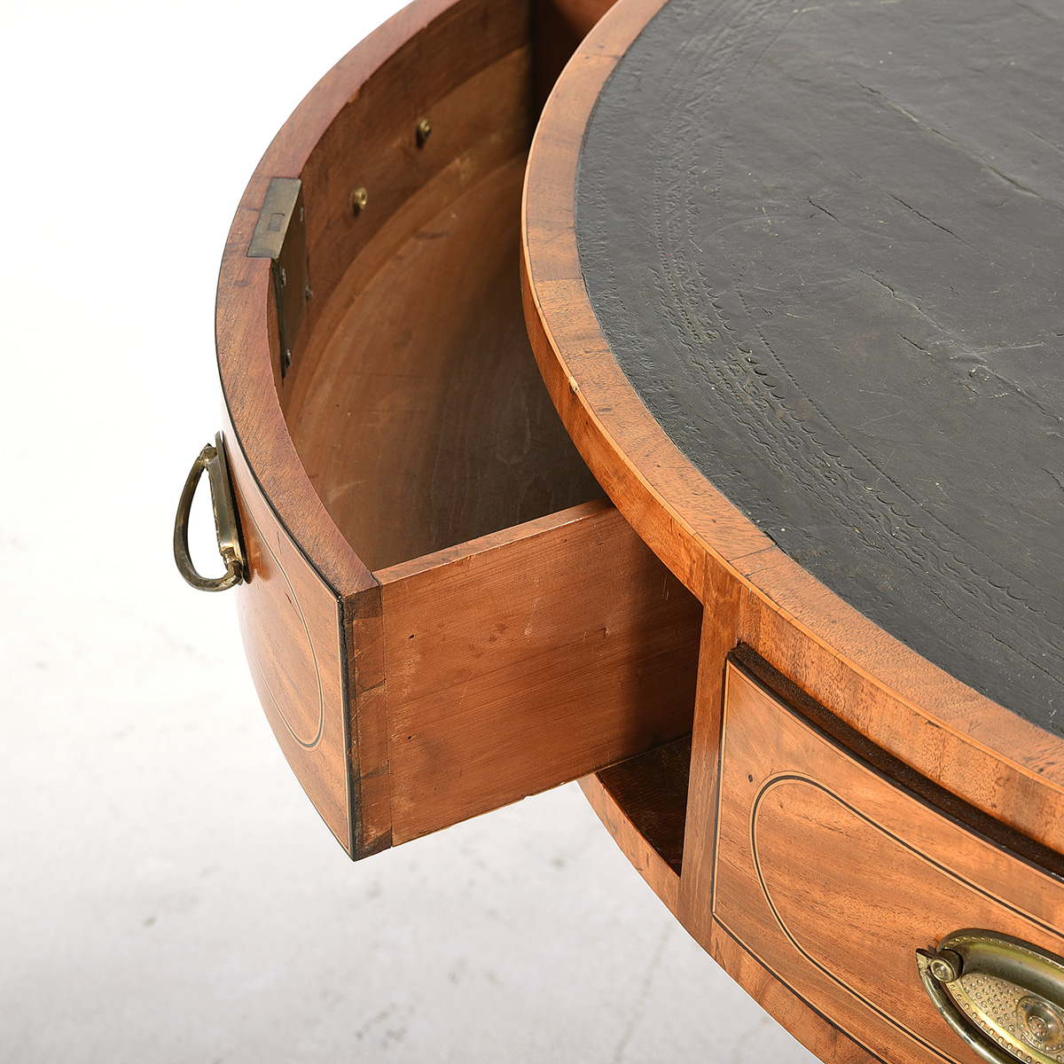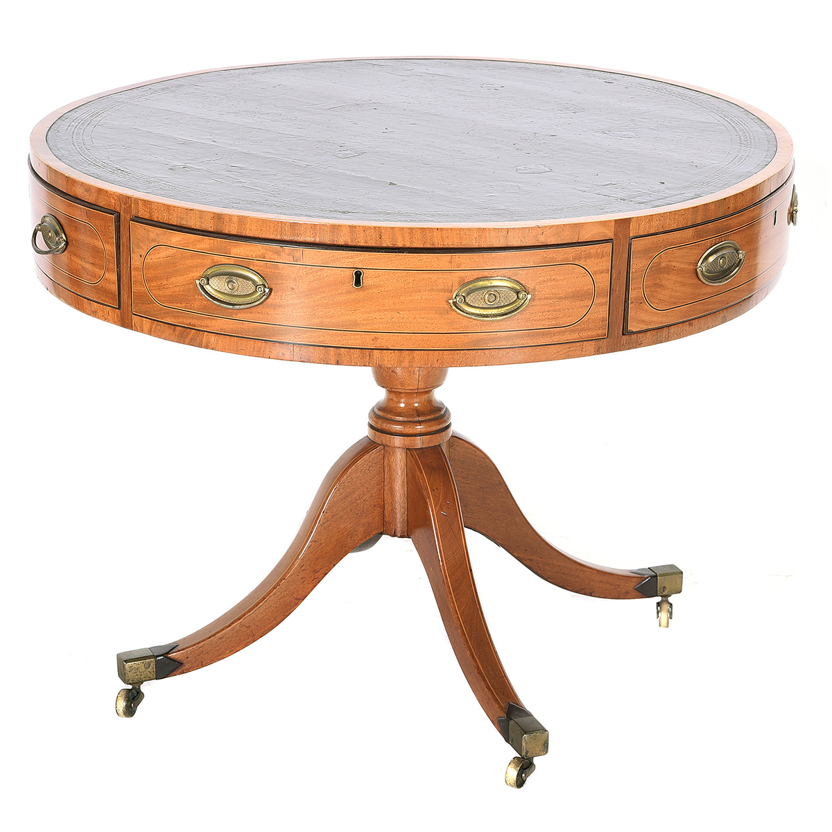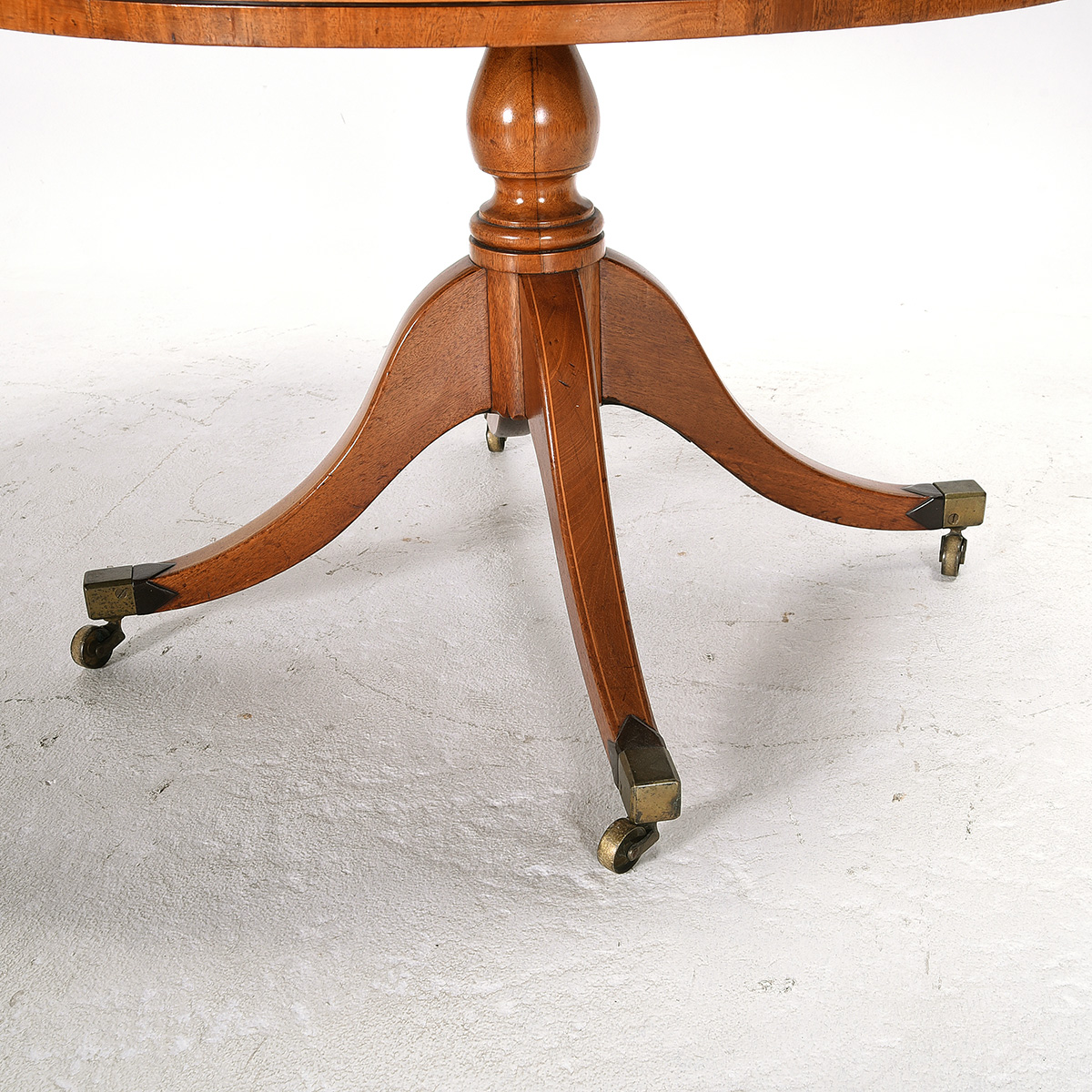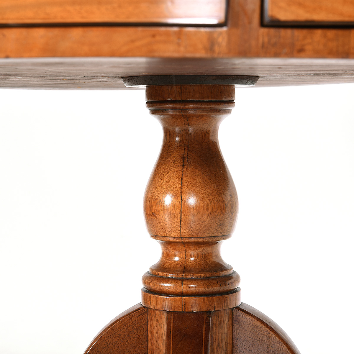 With tooled leather top, above a frieze of five drawers, on a turned column and four downswept legs with brass caps and castors, inlaid stringing to top, drawer perimeters and legs.