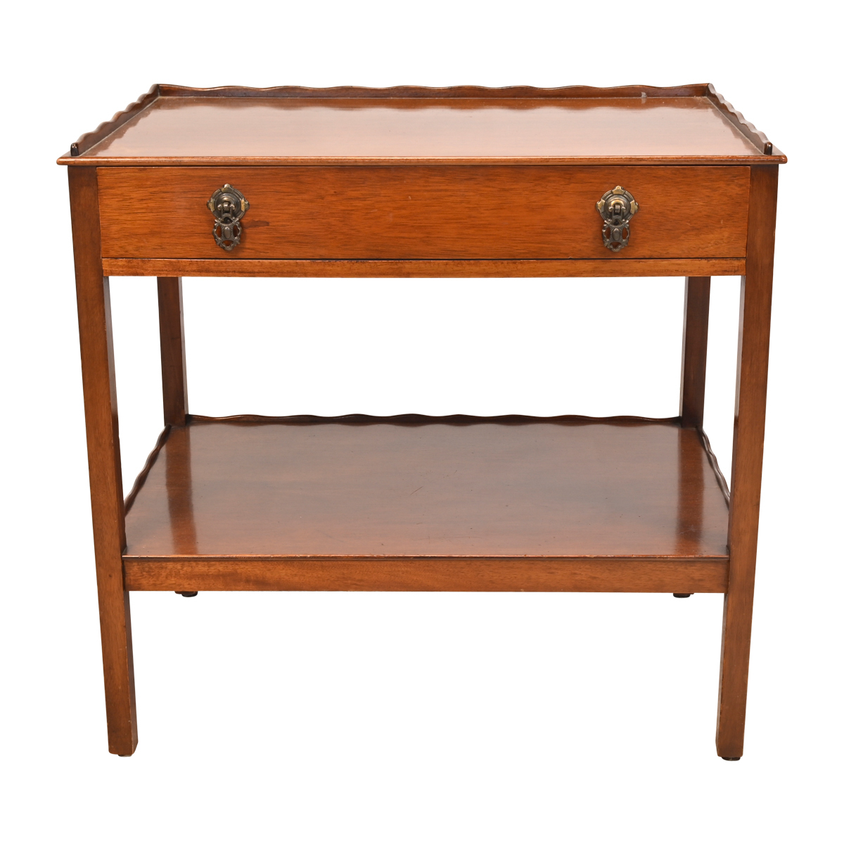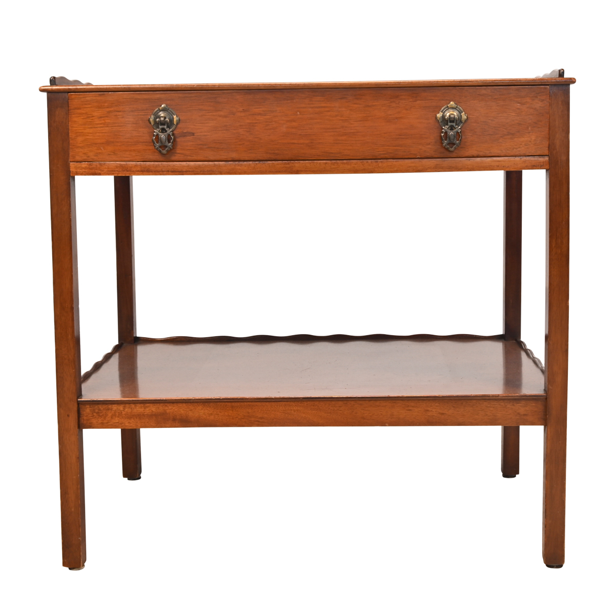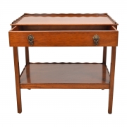 Scalloped wood gallery to the top, single long drawer above a galleried shelf space, square legs.