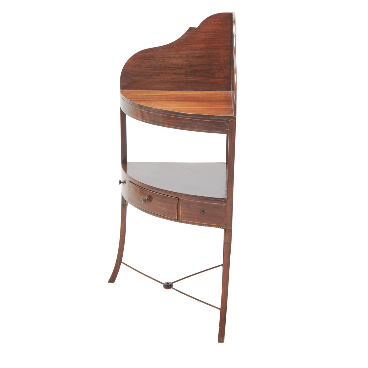 Carved sides, bow front, string inlay. Top shelf over shelf containing one long shallow drawer and two short false drawers, straight rails to sides, three slender dowels conjoined forming the low stretcher.