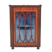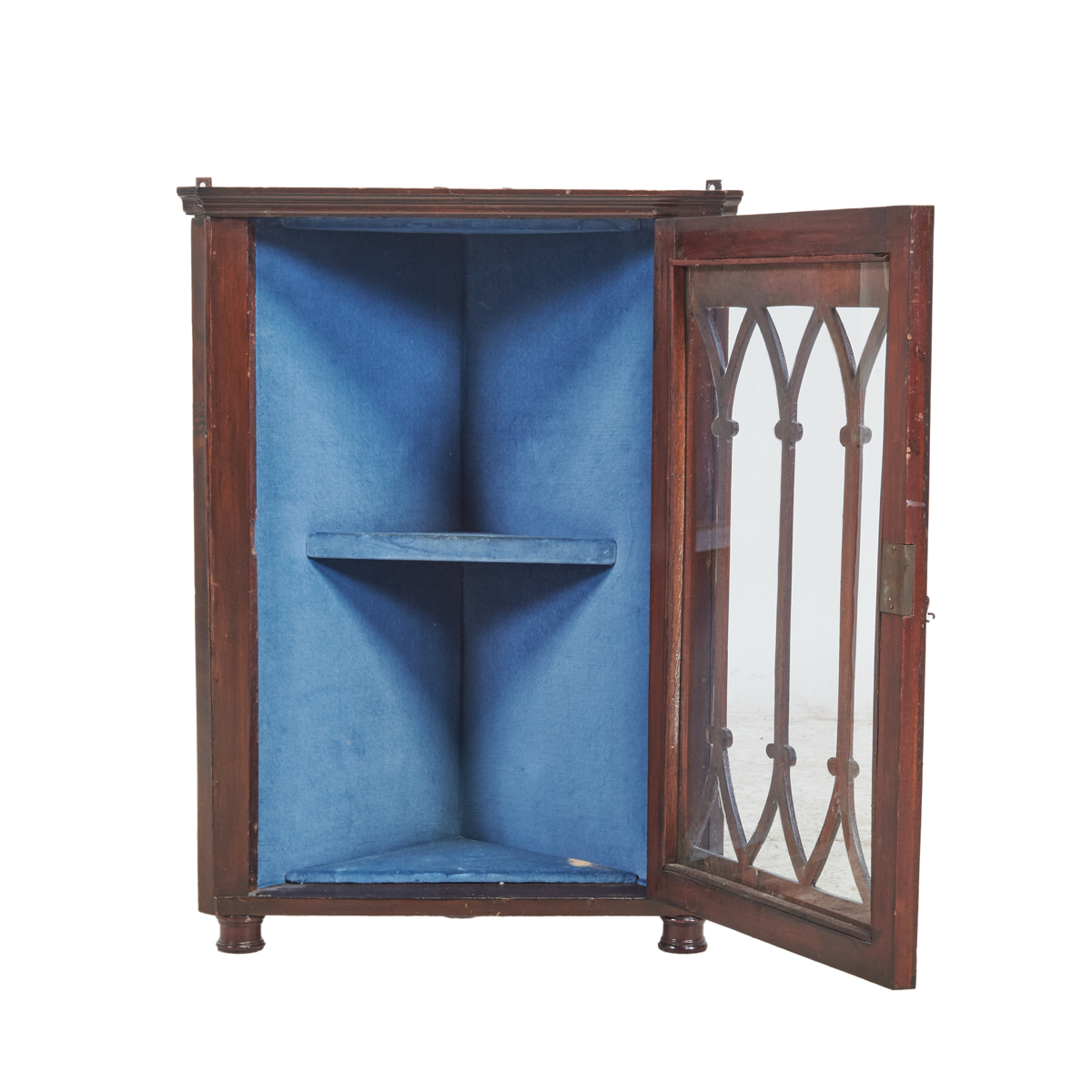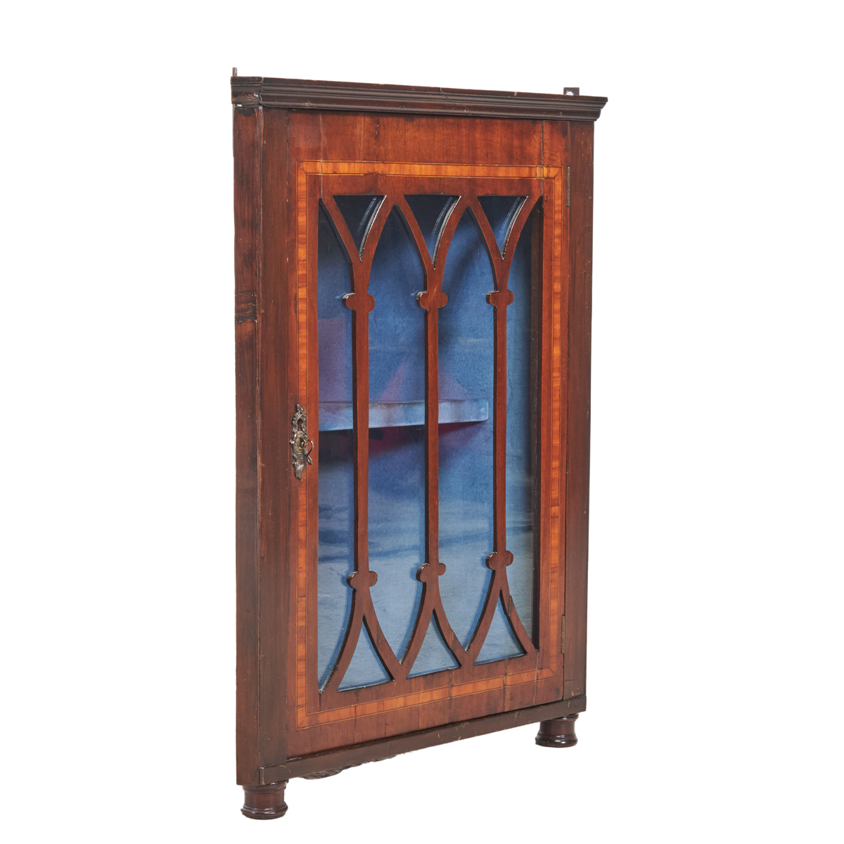 Inlaid accent, glazed cabinet door reveals blue velvet lined interior with single shelf, on turned round feet, also with later brackets for wall mount.