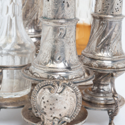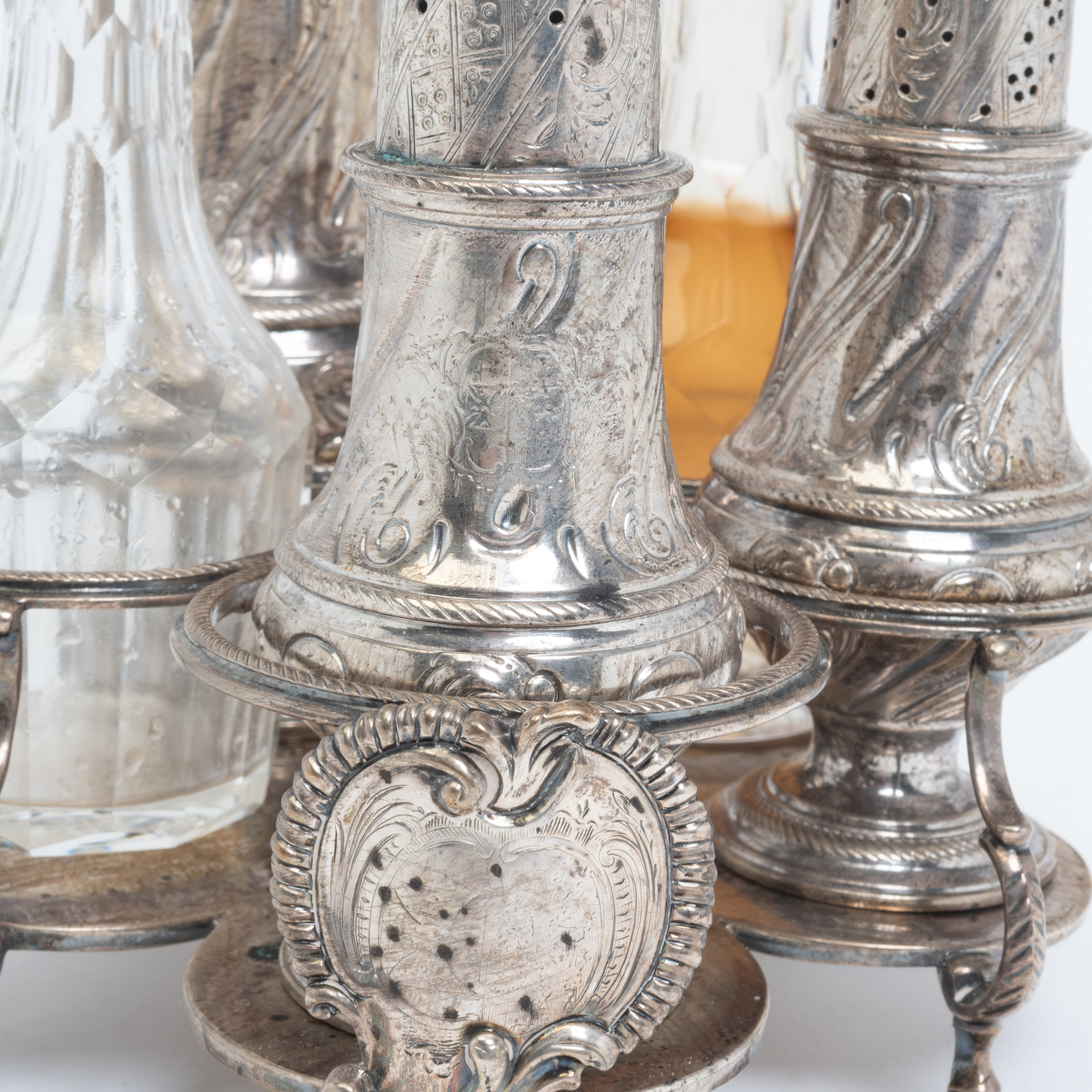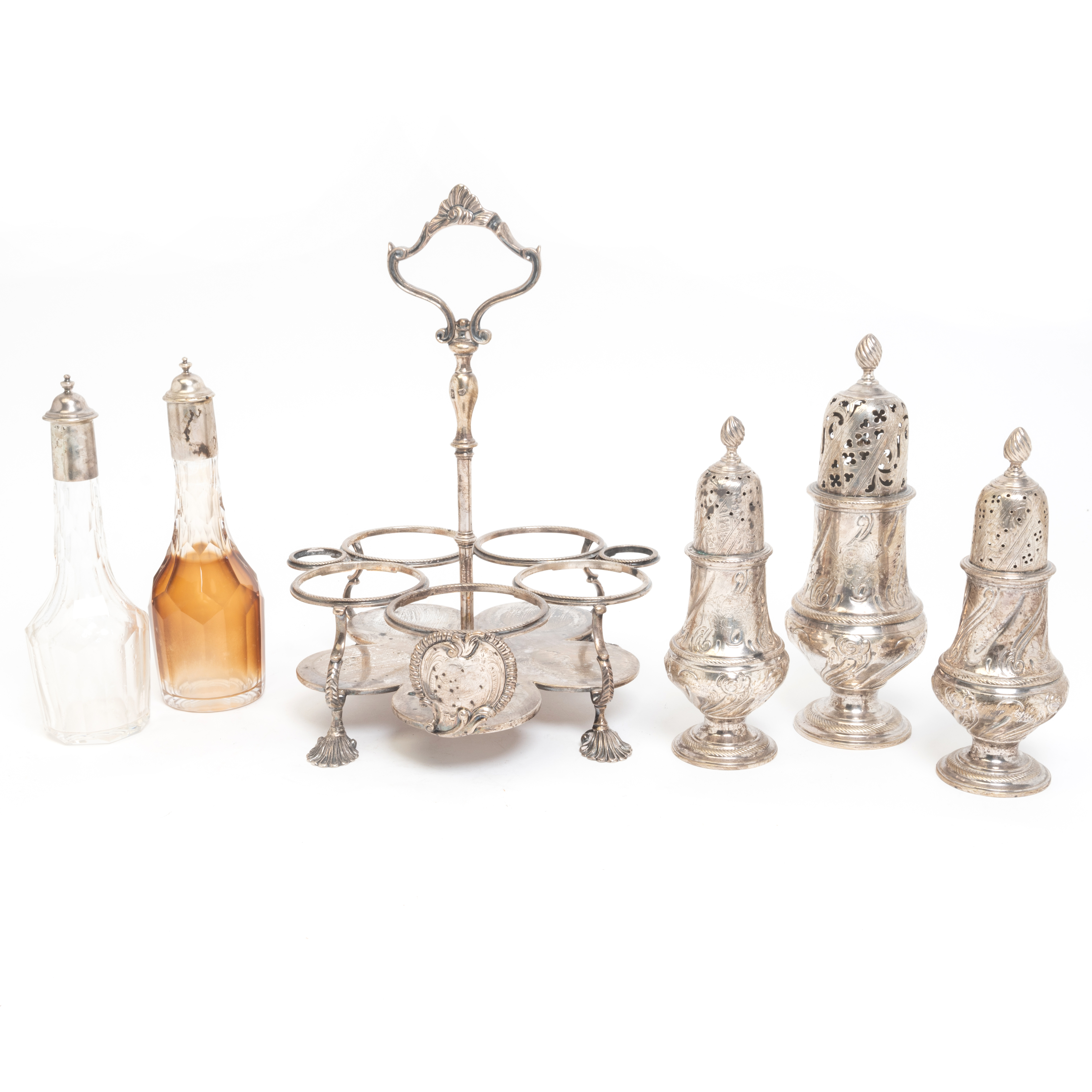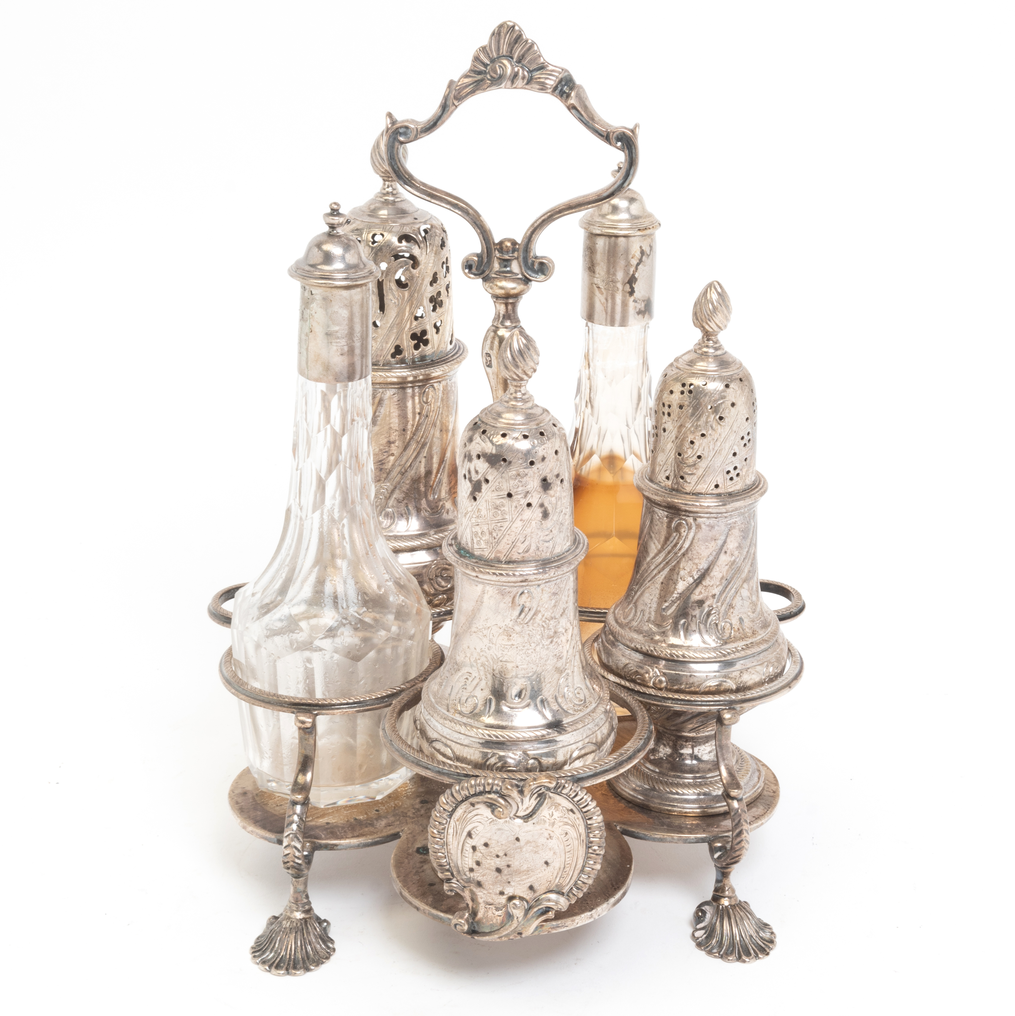 Condition: Some surface wear, tarnish, polish residue, and rubbing throughout. Oil and vinegar residue. One foot with apparent repair. Two open small slots to stand indicates loss to two pieces. Bottles likely later replacements, lack of hallmarks.