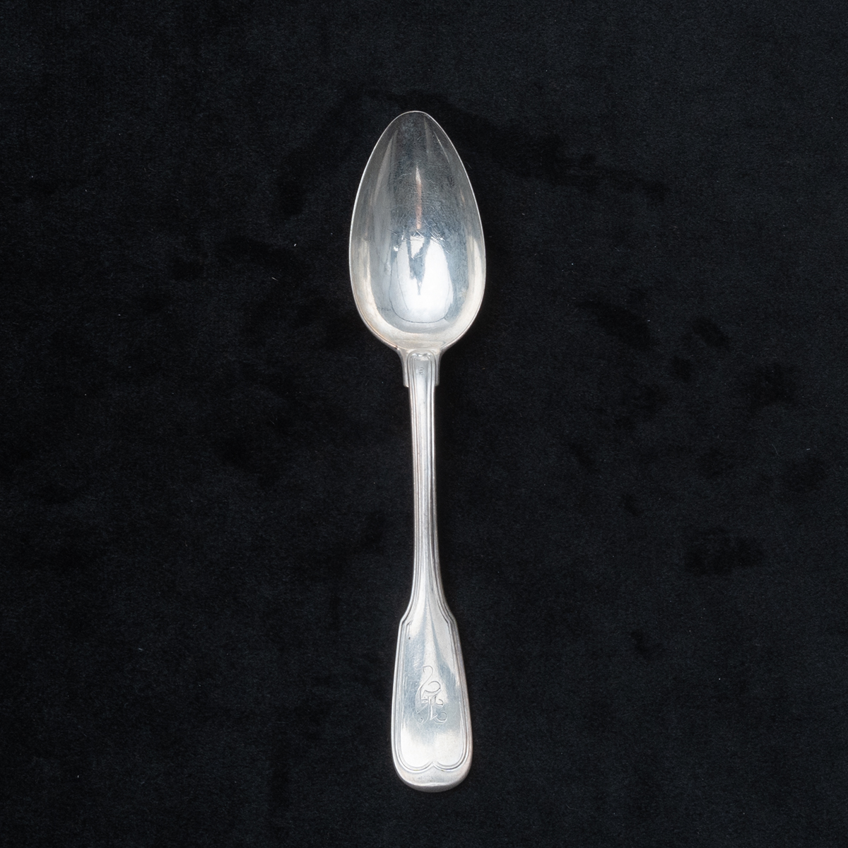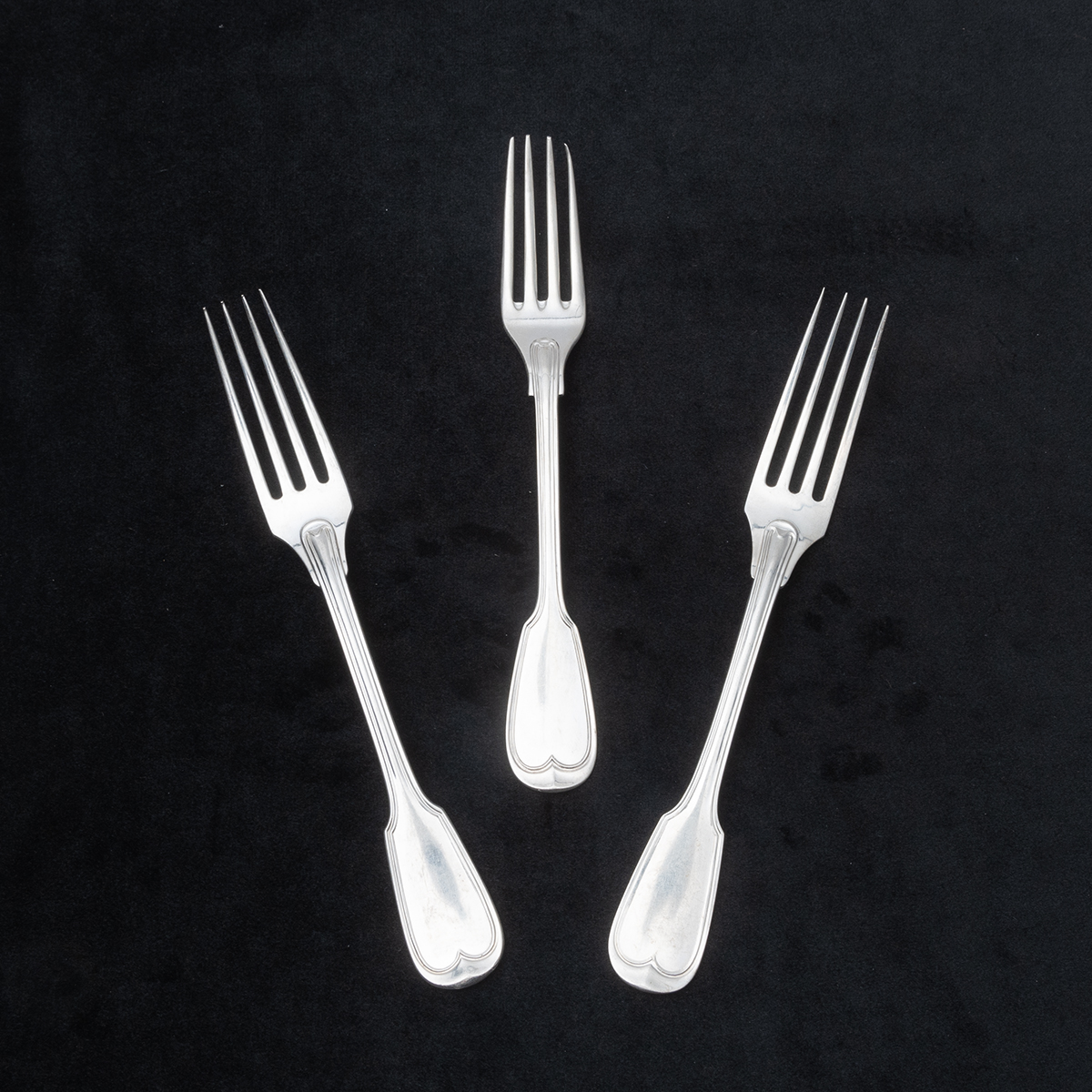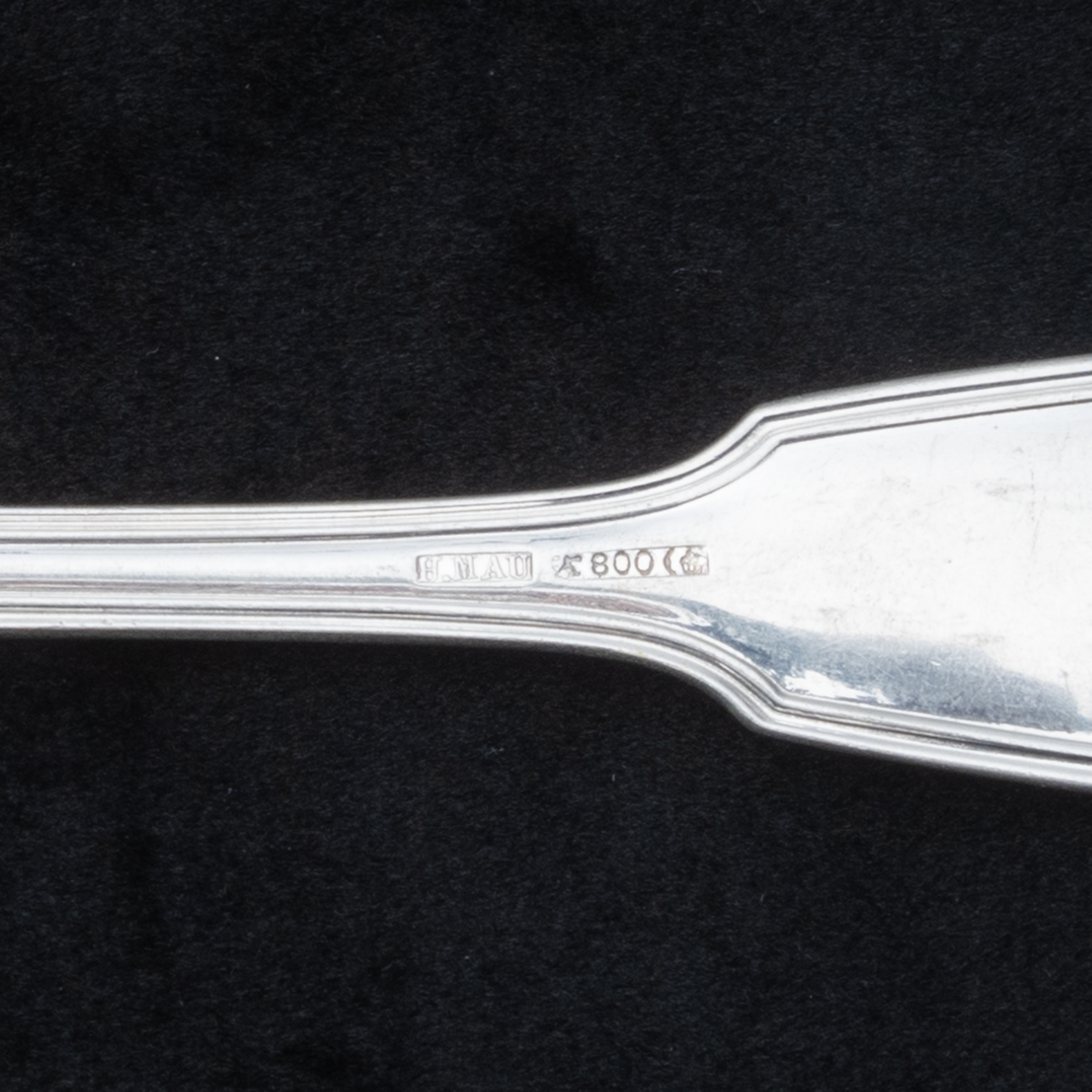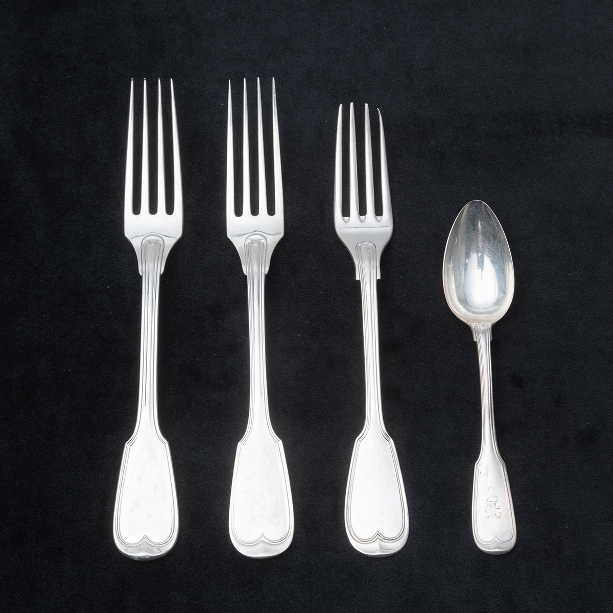 Comprising 12 German H. Mau .800 silver place forks, 4 Mohl .800 silver place forks, 10 Wilkens .750 silver teaspoons with monograms, 6 Belgian silver place forks.