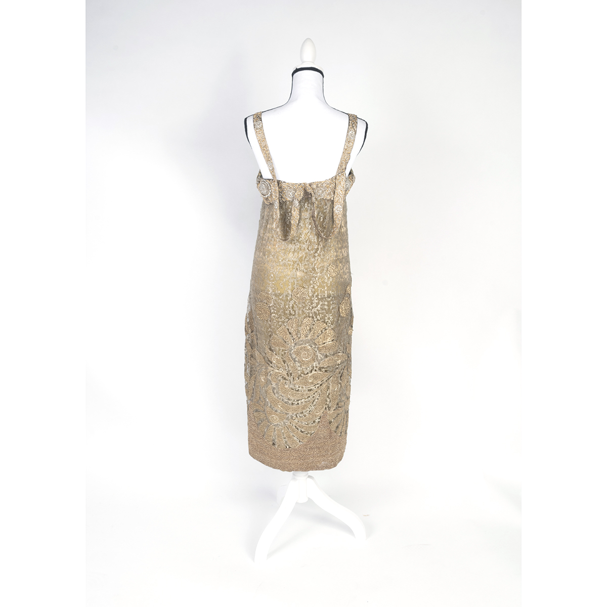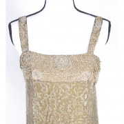 Sleeveless shift, with shoulder straps above yoke, issuing very slightly flared body. Gold lame under layer, with gold and silver lame lace brocade top layer, with pearls and rhinestones in circles and ovals to yoke.
