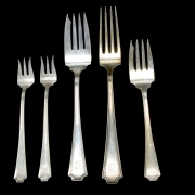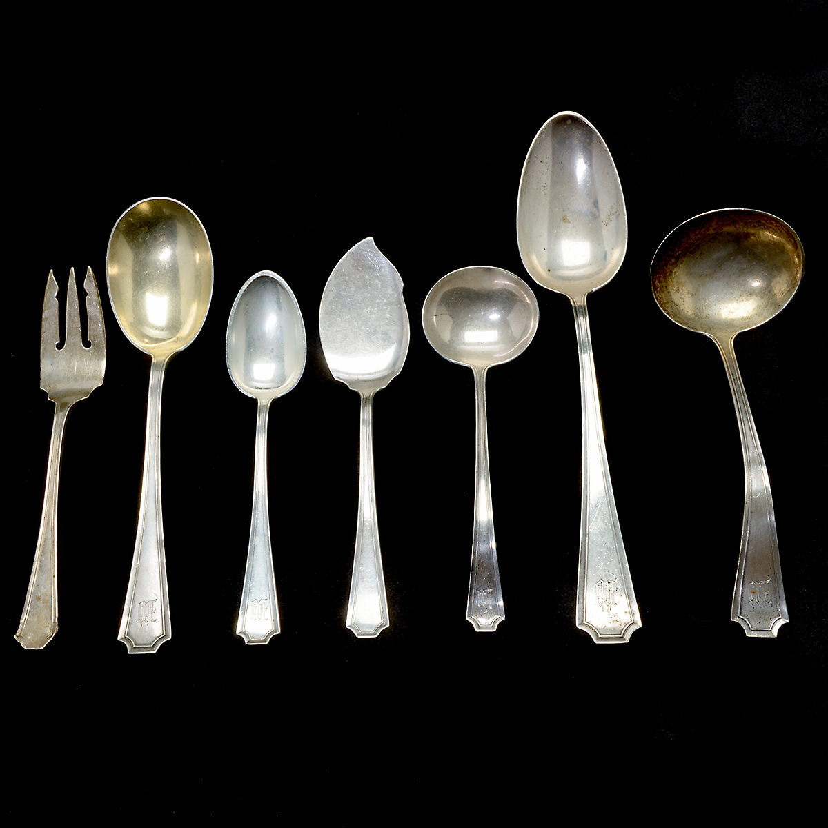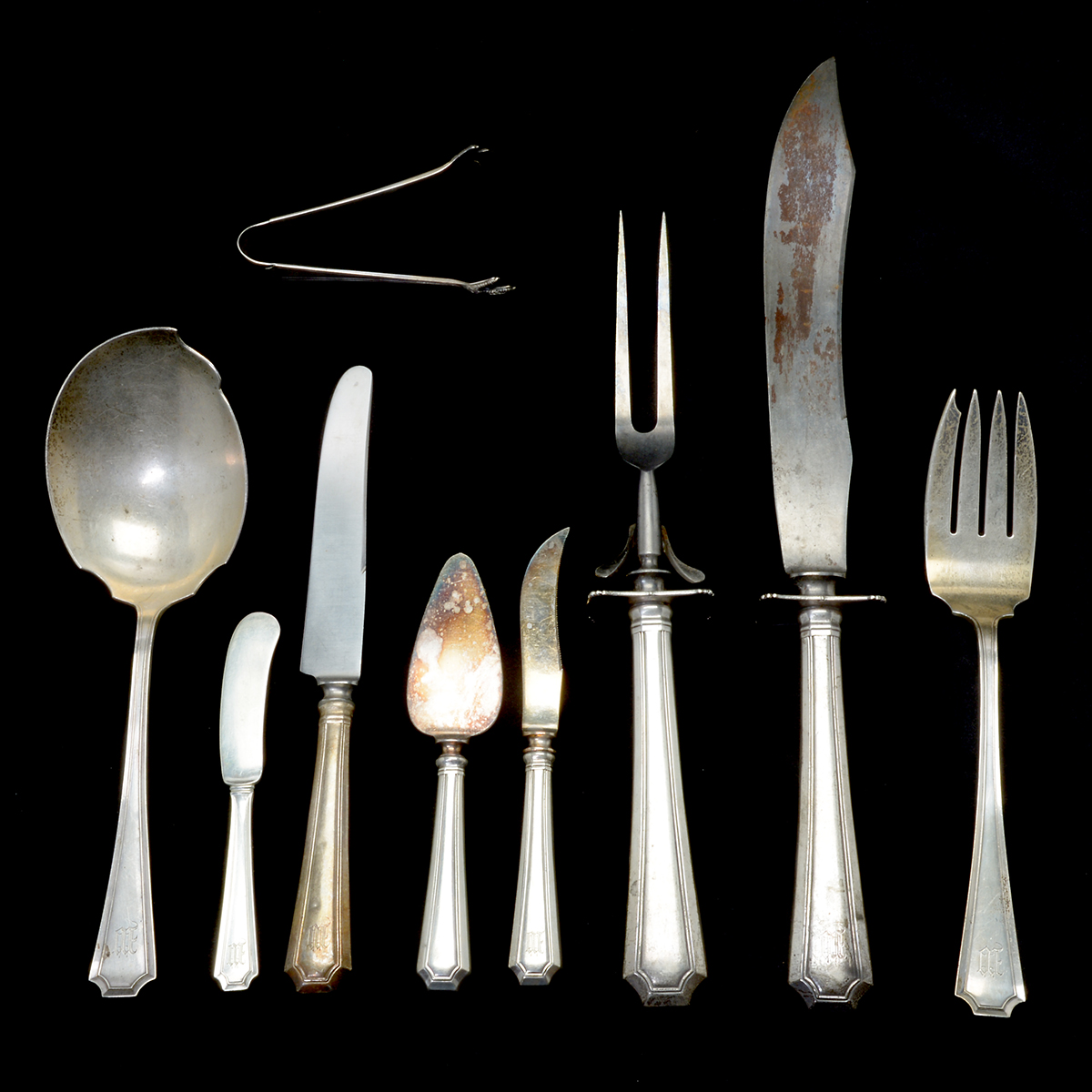 Most pieces with M monogram. Comprising ten dinner knives, eleven fruit knives, twelve butter spreaders, eleven dinner forks, six salad forks, twelve larger salad forks, four fish forks, twelve seafood forks, eight strawberry forks, seventeen teaspoons, six gold-wash chocolate spoons, three tablespoons, gravy ladle, cream ladle, jelly spoon, casserole spoon, small jelly spoon, meat fork, sugar tongs, cheese server, two carving sets of various size, poultry shears, knife sharpener. Additional sterling Towle sugar tongs and sterling teapsoon. (127 pieces total.).