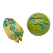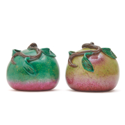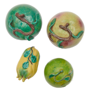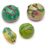 Comprising: two peaches of varying green colors with splashes of red spreading to the bottom base a citron Buddhas hand in a yellow glaze with patches of green a small green apple covered in yellow-green hues, all with vines atop.