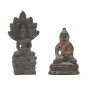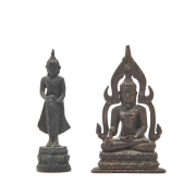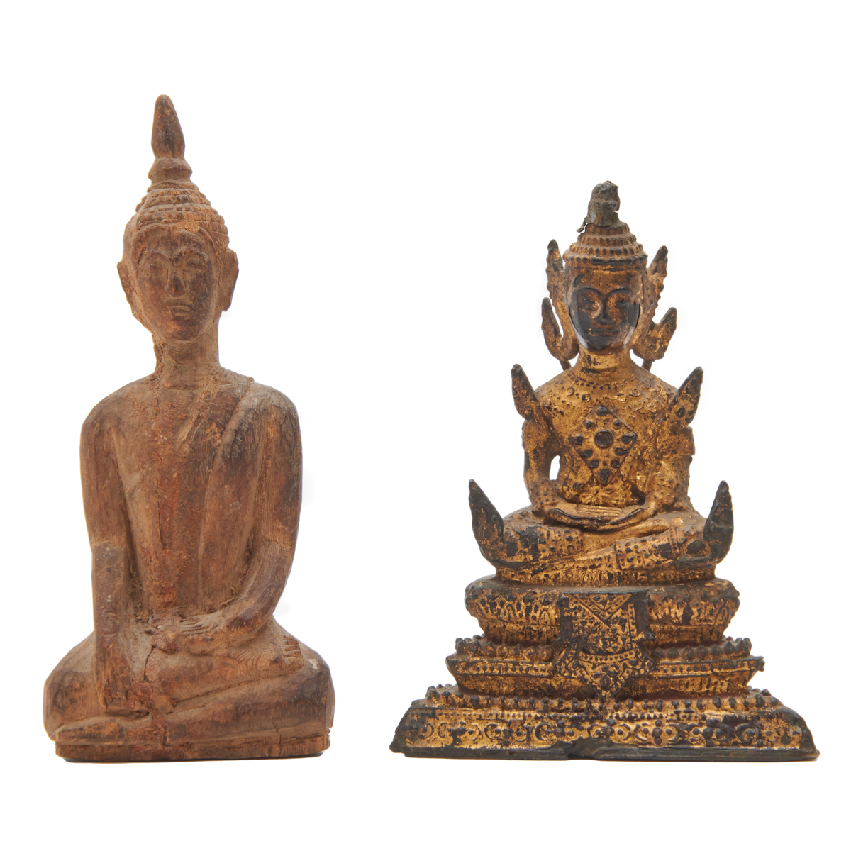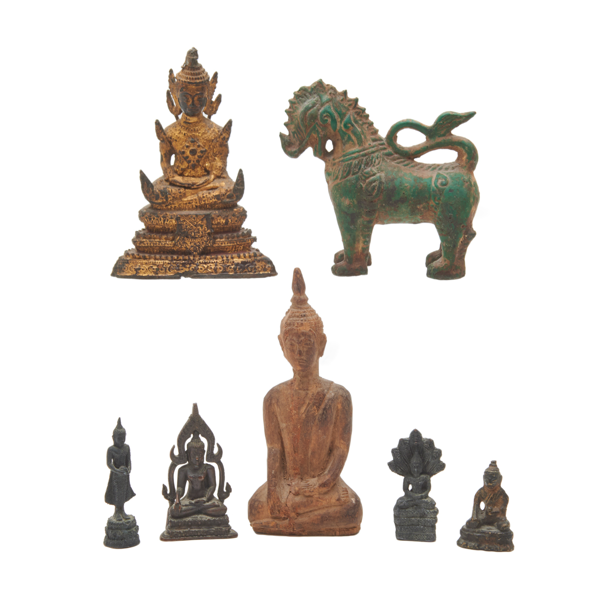 Comprising: a gilt bronze Buddha seated in dhyanasana on an elaborate stepped base, a bronze Buddha standing on a lotus seat carrying an alm bowl with two hands, a bronze Buddhist deity seated in dhyanasana with his left hand carrying an alm bowl on a double lotus seat, a bronze Buddha seated on a double lotus throne backed by an elaborate mandorla, and a seated Buddha on a stepped base sheltering under the seven-headed naga, a wood carved seated Buddha with tight hair arranged in high curls with a ushnisha, and a bronze Singha guardian lion in standing position.