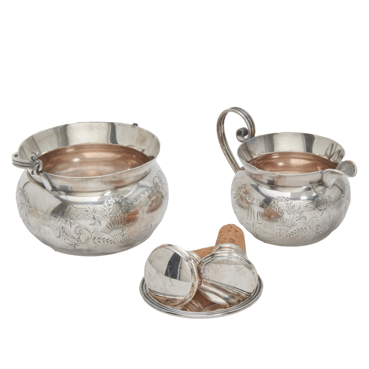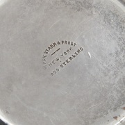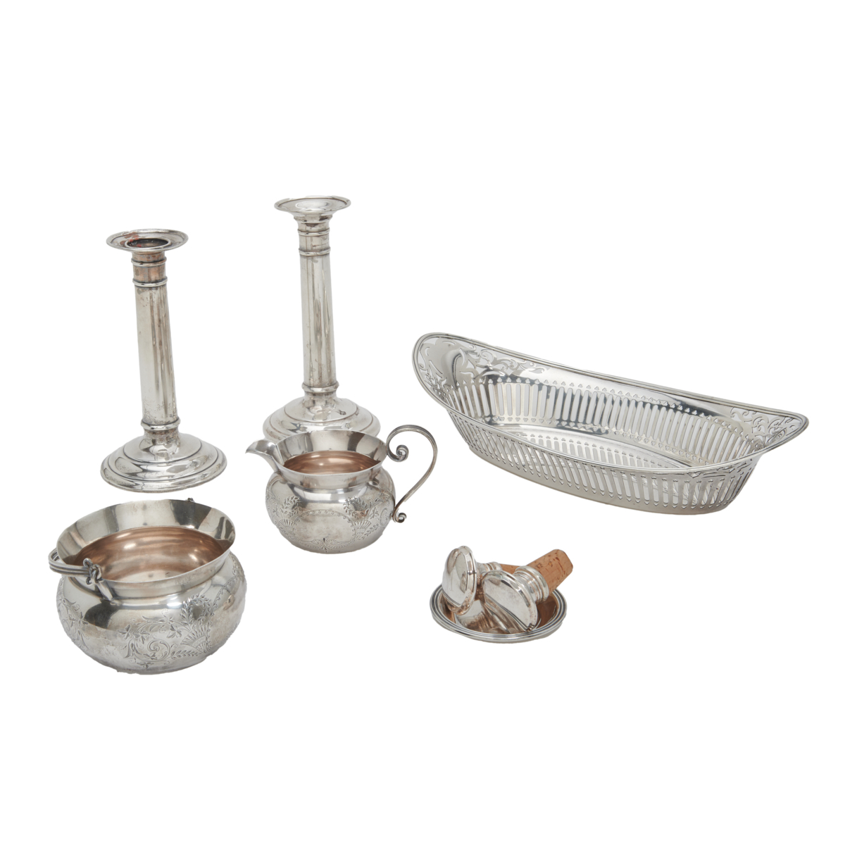 Comprising: Reed Barton navette pierced bowl, Black Starr Frost cream and sugar pair with monogram, pair of candlesticks, miniature dish, two unmarked stoppers with corks.