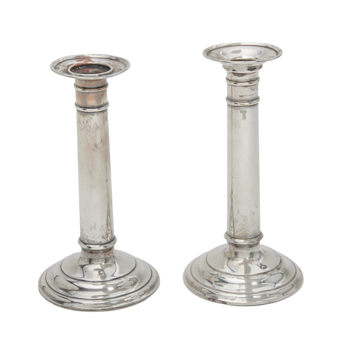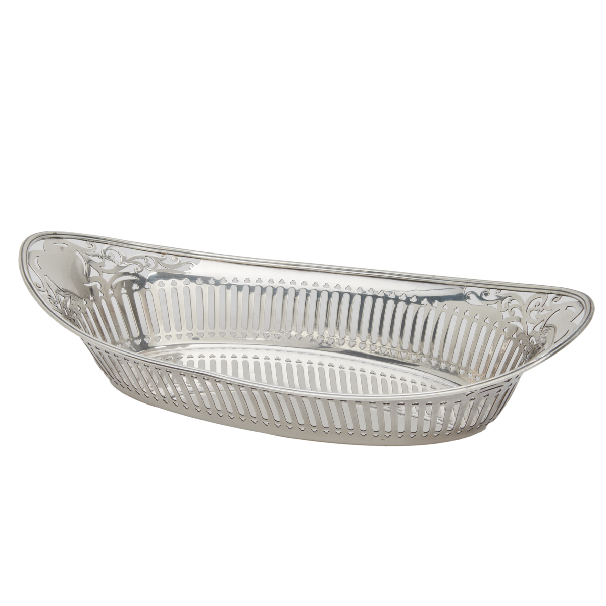 Approximate dimensions: Navette bowl 3 high x 12 1/4 wide x 6 1/8 deep, candlesticks 7 1/4 high. Approximate weight: 1,070 grams..