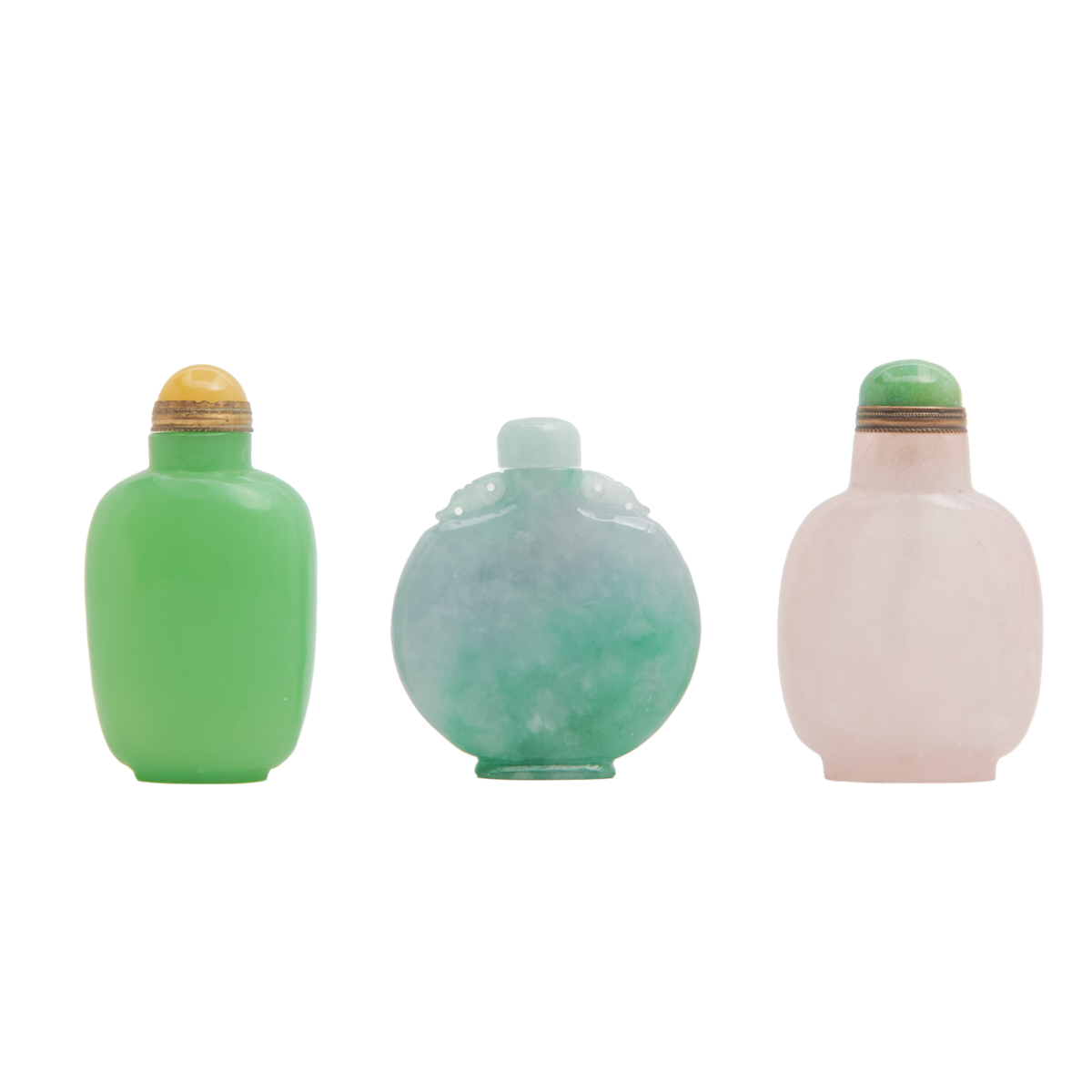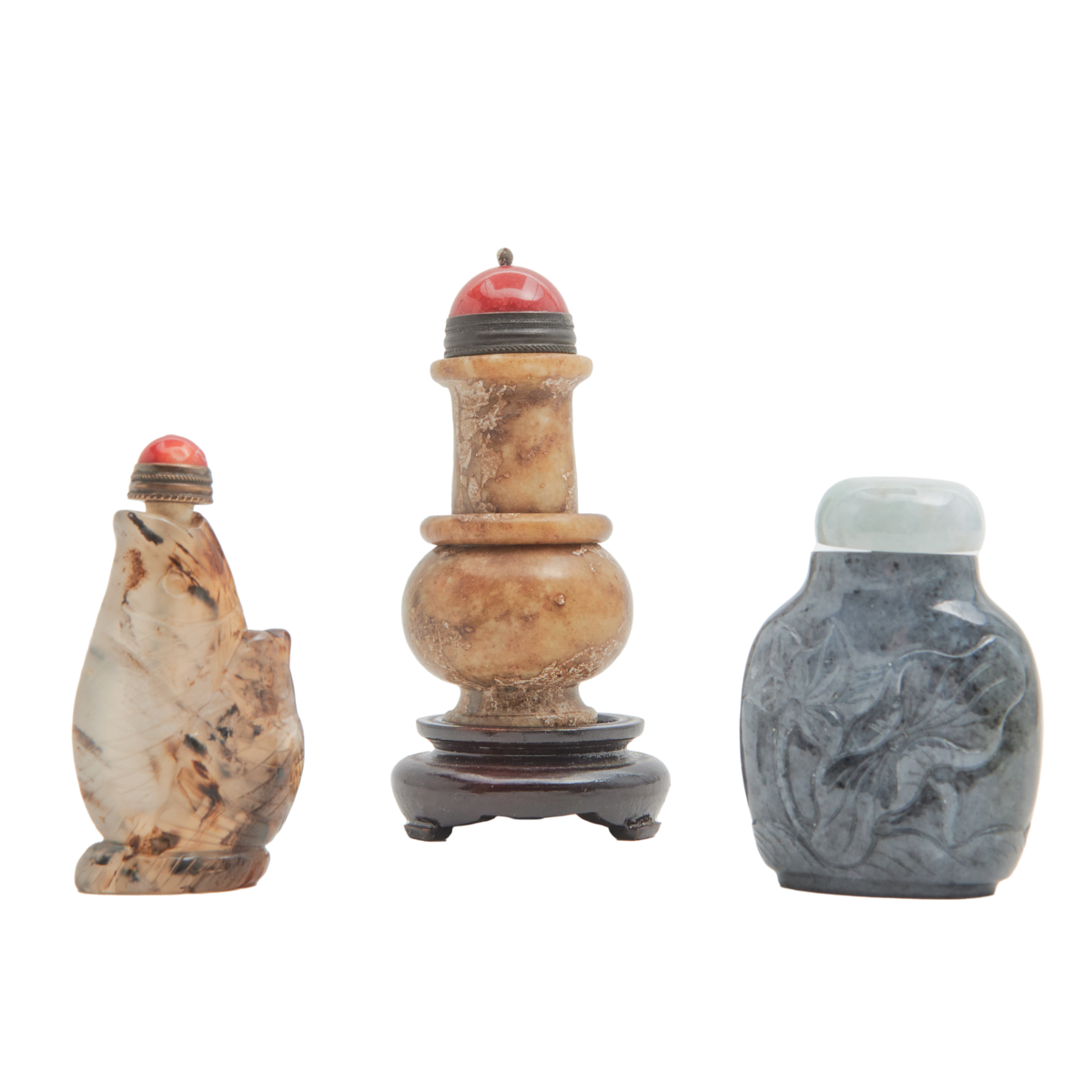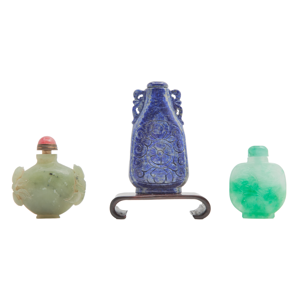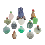 Comprised of thirteen carved snuff bottles in various hardstone including jade, lapis lazuli, serpentine and jasper.