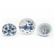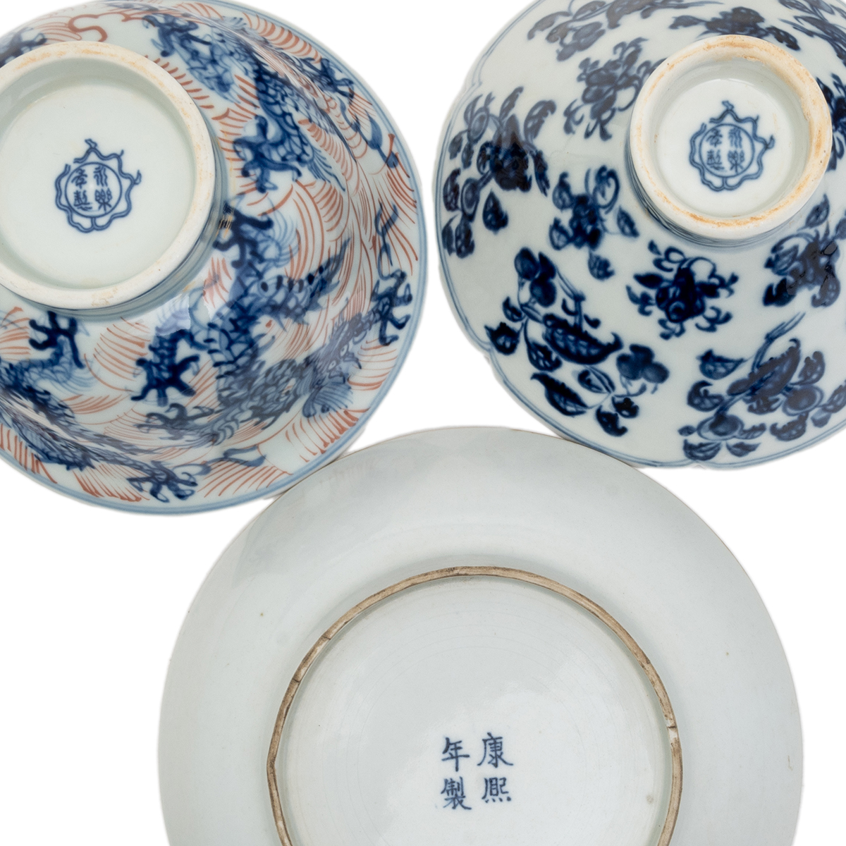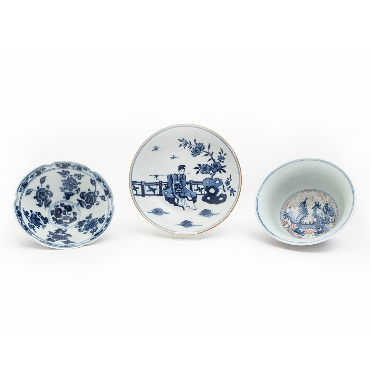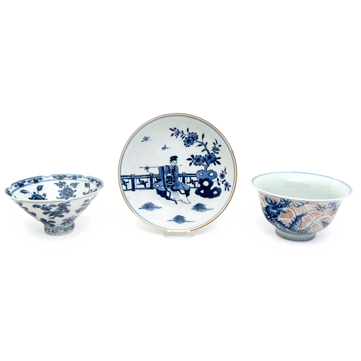 Comprising a finely painted blue and white porcelain bowl painted with fruits and flowers, Yongle mark on the bottom a blue and white porcelain plate portraying a man playing flute in the garden, yellow glaze rim, Kangxi mark on the bottom and a blue and white porcelain bowl with iron red glaze, dragon paintings, Yongle mark on the bottom.