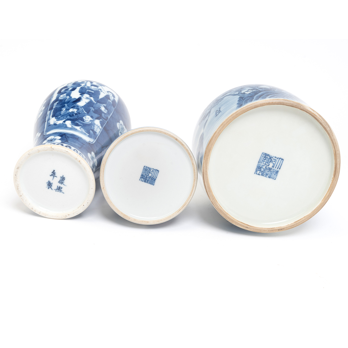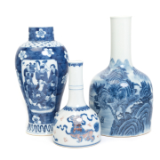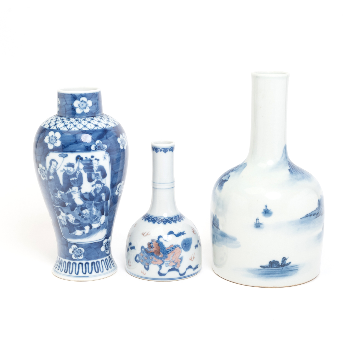 Comprising: The first is a blue and white Meiping vase decorated with the Eight Immortals, bearing a four-character mark on the base. The second is a mallet-shaped vase with exterior decorations in copper red and blue and white glaze, depicting a Foo dog chasing a large brocade ball, and it bears a six-character apocryphal Qianlong mark in underglazed blue. The third is a mallet-shaped blue and white landscape vase, also bearing a six-character apocryphal Qianlong mark in underglazed blue on the recessed base.