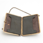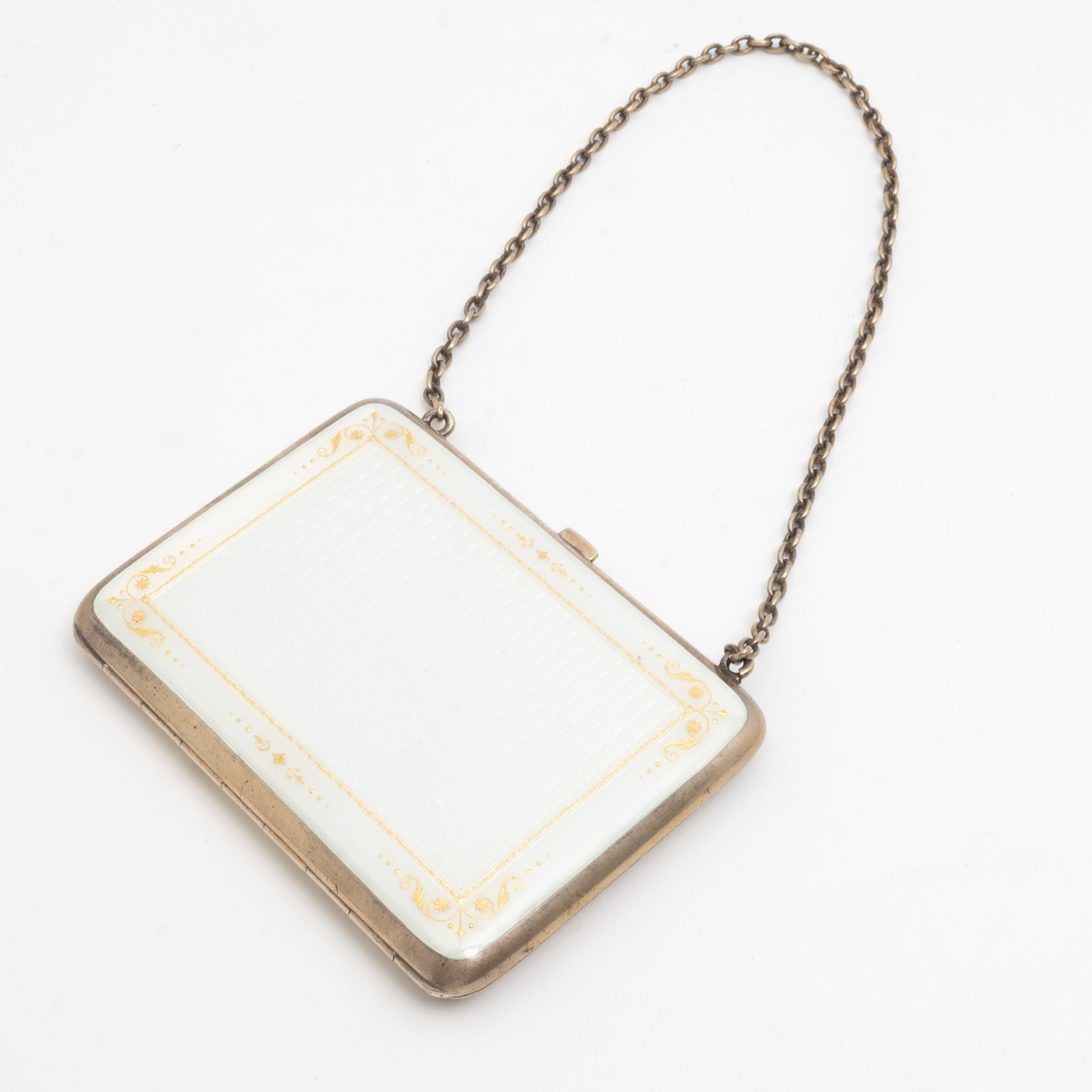 Rounded rectangular form, both sides of the case with off white, bright white and gilt designs, with gilt silver edges. Interior case with two green leather card holder inserts, and brown silk lining. Short chain for hand-carrying attached by two soldered loops to side.